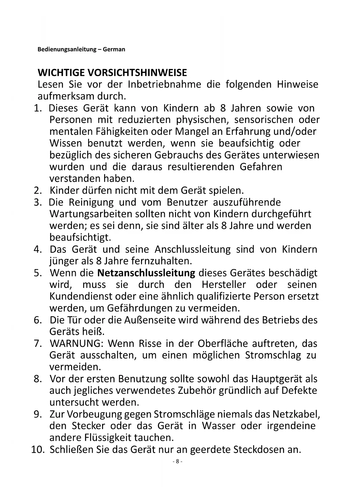 8. Vor der ersten Benutzung sollte sowohl das Hauptgerät als