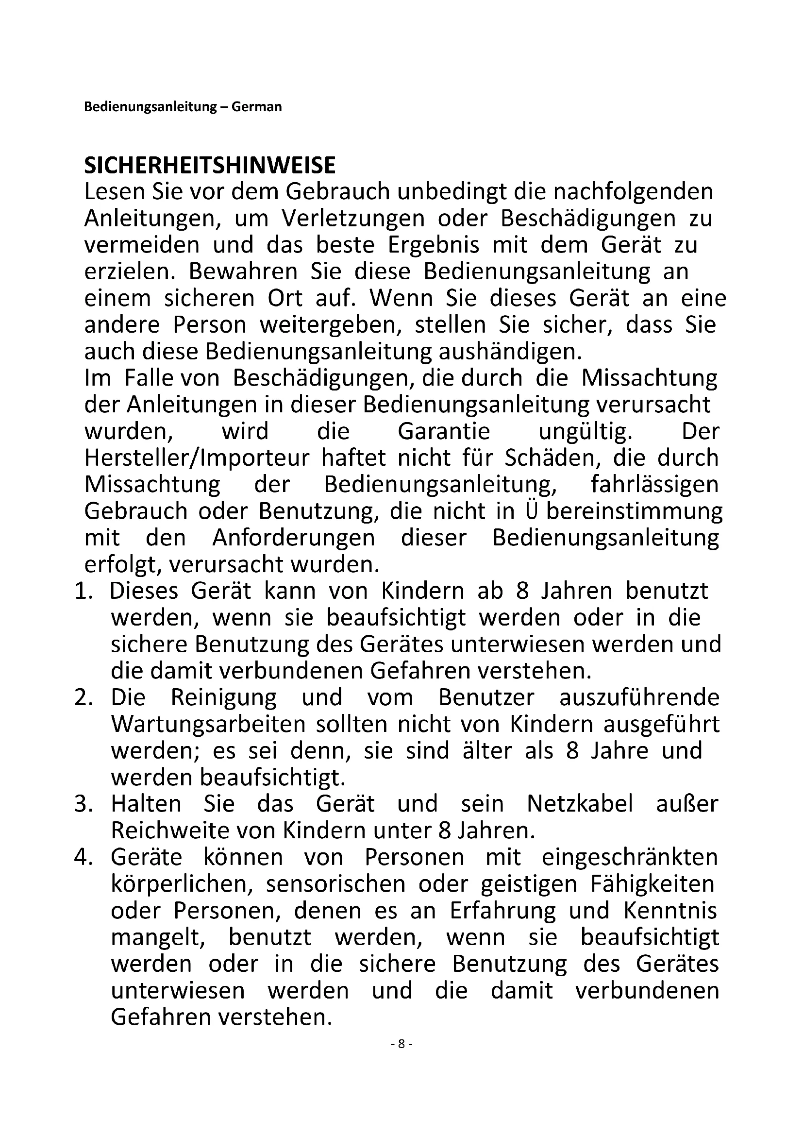 körperlichen, sensorischen oder geistigen Fähigkeiten oder Personen, denen es an Erfahrung und Kenntnis mangelt, benutzt werden, wenn sie beaufsichtigt werden oder in die sichere Benutzung des Gerätes unterwiesen werden und die damit verbundenen Gefahren verstehen.- 9 -