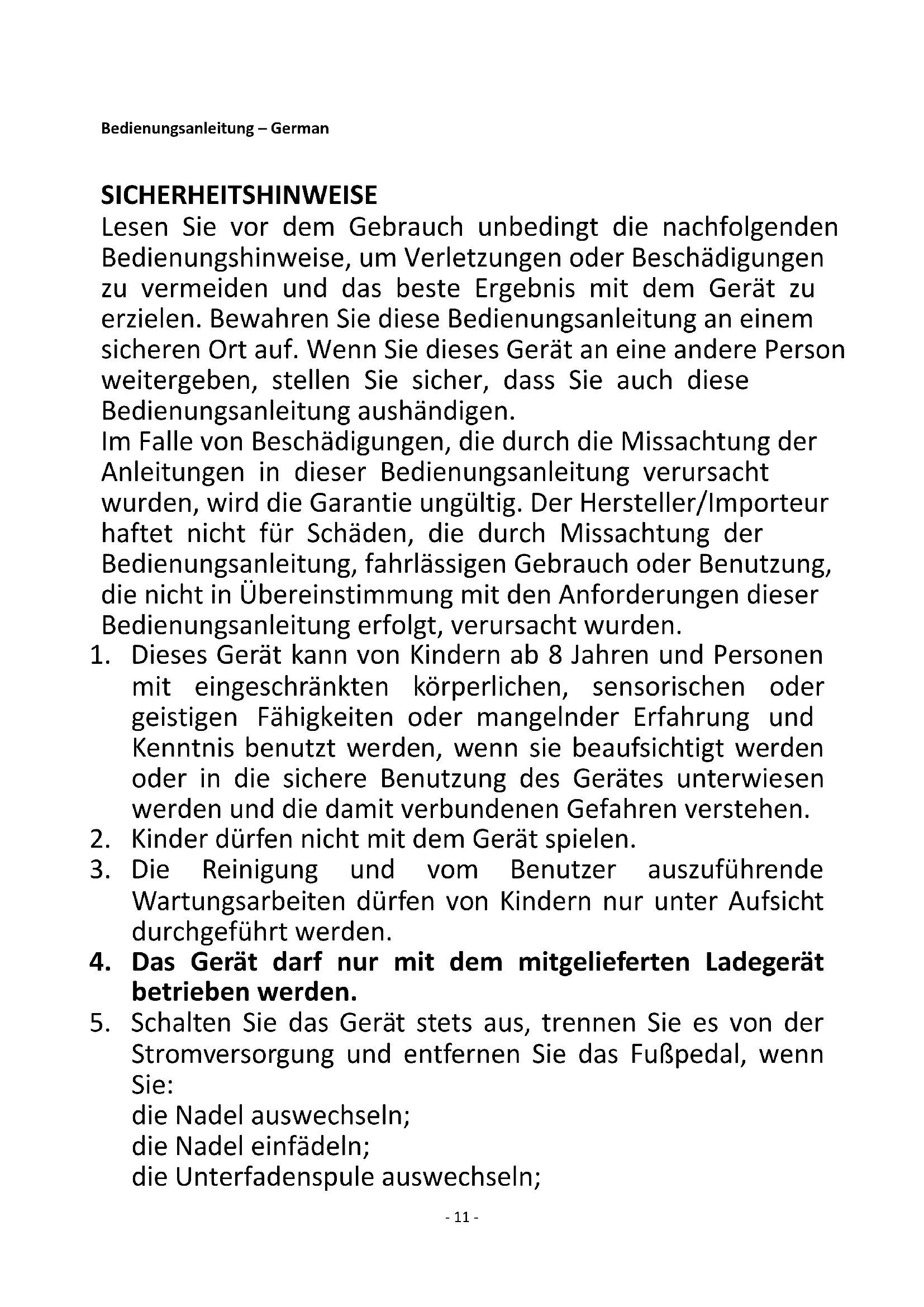 4. Das Gerät darf nur mit dem mitgelieferten Ladegerät