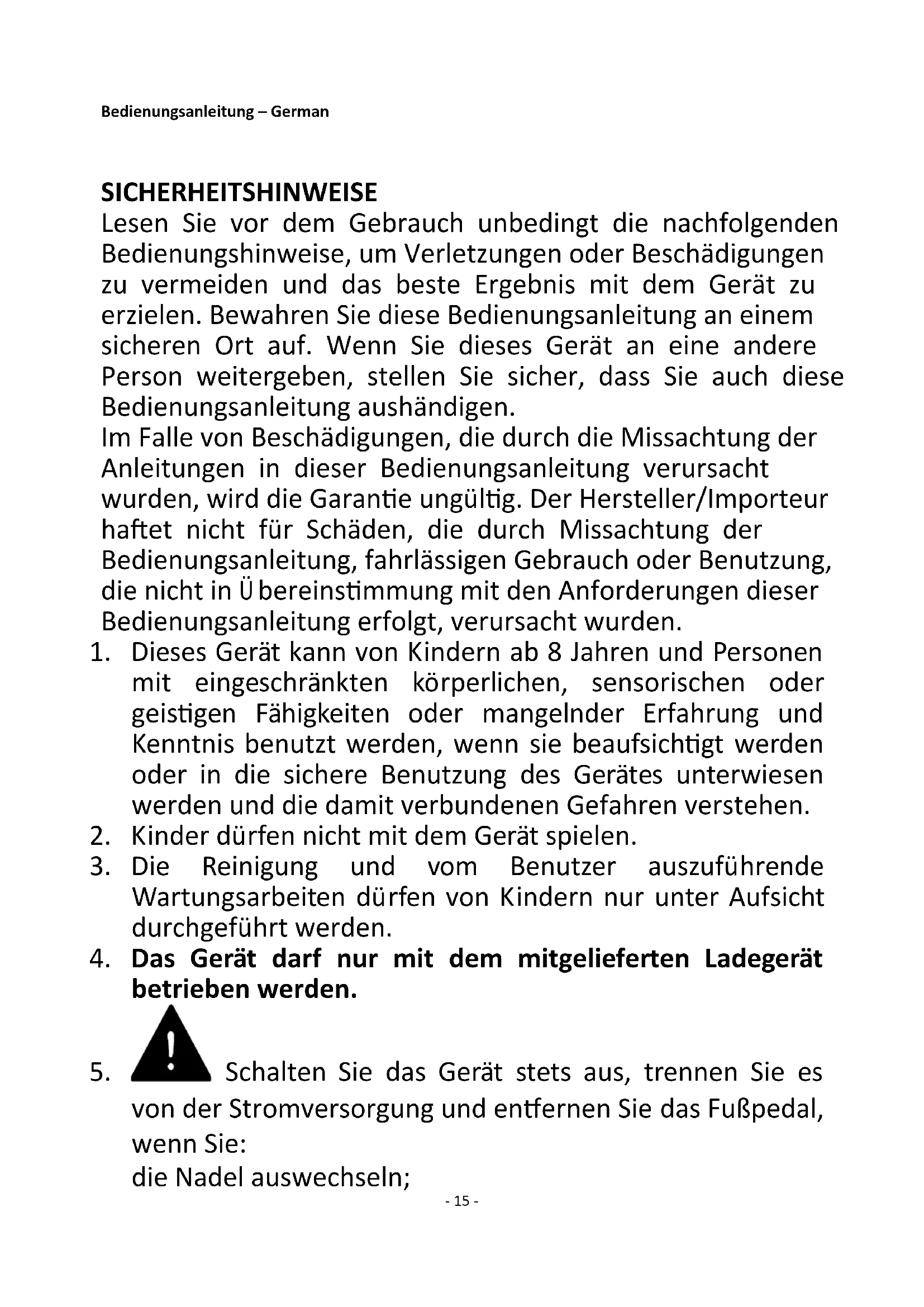 4. Das Gerät darf nur mit dem mitgelieferten Ladegerät
