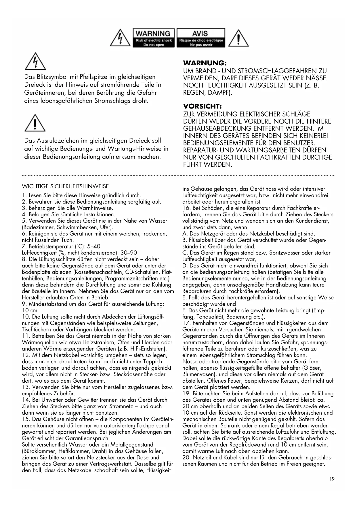Geräteinneren Versuchen Sie niemals, mit irgendwelchen Gegenständen durch die Öffnungen des Geräts im Inneren herumzustochern, denn dabei laufen Sie Gefahr, spannungs- führende Teile zu berühren oder kurzuschließen, was zu einem lebensgefährlichem Stromschlag führen kann. Nasse oder tropfende Gegenstände bitte vom Gerät fern- halten, ebenso flüssigkeitsgefüllte offene Behälter (Gläser, Blumenvasen), und diese vor allem niemals auf dem Gerät abstellen. Offenes Feuer, beispielsweise Kerzen, darf nicht auf dem Gerät platziert werden.