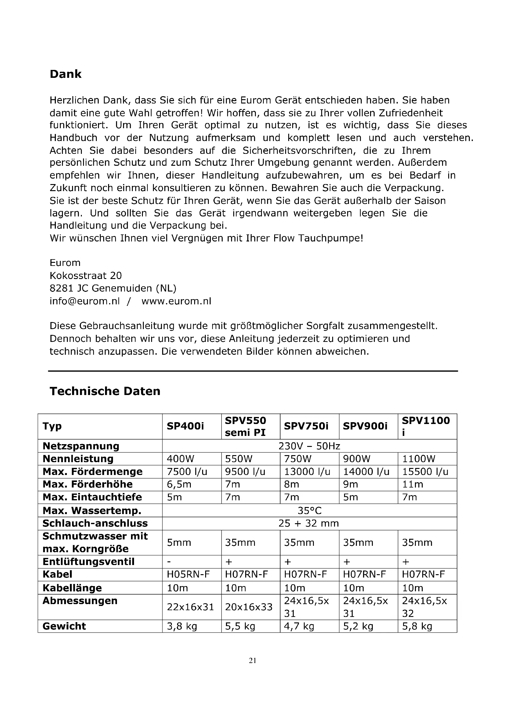 Guarantee The submersible pump you have purchased comes with the usual guarantee which applies to production and material defects. The following damage and defects are not covered by the guarantee: Wear and tear and defects in relation to mechanical seals caused by drying out or the presence of specific substances and/or objects in the water. Blockage of the blade by foreign objects Transport damage Damage caused by unreasonable use Defects that unauthorised persons have attempted to resolve or which have been caused by improper repairs Damage due to overheating The guarantee and liability of the supplier, importer and manufacturer will be nullified if the pump is opened by unauthorised persons or modifications or additions are made to the pump.20 Removal In the EU this symbol indicates that this product may not be disposed of as ordinary household waste. Old equipment contains valuable materials, suitable for recycling. These materials should be made suitable for reuse in order to prevent any adverse effects to health and the environment caused by unregulated waste collection. Therefore, please make sure that you bring old equipment to a designated collection point. Alternatively, contact the original supplier, who can make sure that as many of the components as possible can be recycled CE-declaration See page 71.21 Dank Herzlichen Dank, dass Sie sich für eine Eurom Gerät entschieden haben. Sie haben damit eine gute Wahl getroffen! Wir hoffen, dass sie zu Ihrer vollen Zufriedenheit funktioniert. Um Ihren Gerät optimal zu nutzen, ist es wichtig, dass Sie dieses Handbuch vor der Nutzung aufmerksam und komplett lesen und auch verstehen. Achten Sie dabei besonders auf die Sicherheitsvorschriften, die zu Ihrem persönlichen Schutz und zum Schutz Ihrer Umgebung genannt werden. Außerdem empfehlen wir Ihnen, dieser Handleitung aufzubewahren, um es bei Bedarf in Zukunft noch einmal konsultieren zu können. Bewahren Sie auch die Verpackung. Sie ist der beste Schutz für Ihren Gerät, wenn Sie das Gerät außerhalb der Saison lagern. Und sollten Sie das Gerät irgendwann weitergeben legen Sie die Handleitung und die Verpackung bei. Wir wünschen Ihnen viel Vergnügen mit Ihrer Flow Tauchpumpe! Eurom Kokosstraat 20 8281 JC Genemuiden (NL) info@eurom.nl / www.eurom.nl Diese Gebrauchsanleitung wurde mit größtmöglicher Sorgfalt zusammengestellt. Dennoch behalten wir uns vor, diese Anleitung jederzeit zu optimieren und technisch anzupassen. Die verwendeten Bilder können abweichen.