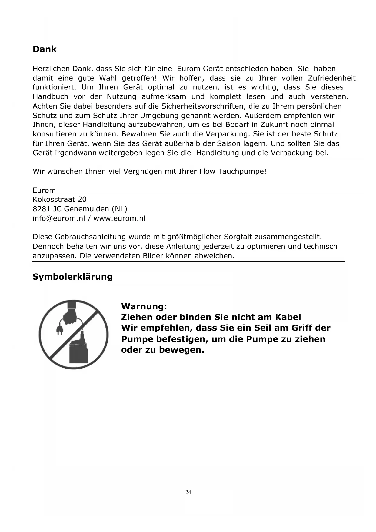 Too little pump capacity due to dirt or sandy Clean the pump and have worn- out parts replaced. Pump does not start or suddenly stops during operations. Thermal protection stops the pump due to overheating. The water is too hot. Power outage Plug out of the socket Dirt or little stones in the water supply Vane is blocked. The coil of the stator has burnt out. See Overheating Protection section. Maximum water temperature is 40°C. Check the fuses and the earth leakage circuit breaker. Insert the plug. Remove dirt and little stones. Remove the dirt. Rewind and overhaul the coil. Turns of the stator is burnt out. Short-circuit, possibly due to a leak Blocked vane Pump is started too frequently. Pump is overloaded. In all cases: Remove the reason and have the stator rewound. Send the pump for repair to your supplier or service station. Pump produces suddenly less water. Suction openings are blocked. Clean the openings.23 Removal In the EU this symbol indicates that this product may not be disposed of as ordinary household waste. Old equipment contains valuable materials, suitable for recycling. These materials should be made suitable for reuse in order to prevent any adverse effects to health and the environment caused by unregulated waste collection. Therefore, please make sure that you bring old equipment to a designated collection point. Alternatively, contact the original supplier, who can make sure that as many of the components as possible can be recycled CE-declaration See page 46.24 Dank Herzlichen Dank, dass Sie sich für eine Eurom Gerät entschieden haben. Sie haben damit eine gute Wahl getroffen! Wir hoffen, dass sie zu Ihrer vollen Zufriedenheit funktioniert. Um Ihren Gerät optimal zu nutzen, ist es wichtig, dass Sie dieses Handbuch vor der Nutzung aufmerksam und komplett lesen und auch verstehen. Achten Sie dabei besonders auf die Sicherheitsvorschriften, die zu Ihrem persönlichen Schutz und zum Schutz Ihrer Umgebung genannt werden. Außerdem empfehlen wir Ihnen, dieser Handleitung aufzubewahren, um es bei Bedarf in Zukunft noch einmal konsultieren zu können. Bewahren Sie auch die Verpackung. Sie ist der beste Schutz für Ihren Gerät, wenn Sie das Gerät außerhalb der Saison lagern. Und sollten Sie das Gerät irgendwann weitergeben legen Sie die Handleitung und die Verpackung bei. Wir wünschen Ihnen viel Vergnügen mit Ihrer Flow Tauchpumpe! Eurom Kokosstraat 20 8281 JC Genemuiden (NL) info@eurom.nl / www.eurom.nl Diese Gebrauchsanleitung wurde mit größtmöglicher Sorgfalt zusammengestellt. Dennoch behalten wir uns vor, diese Anleitung jederzeit zu optimieren und technisch anzupassen. Die verwendeten Bilder können abweichen. Symbolerklärung