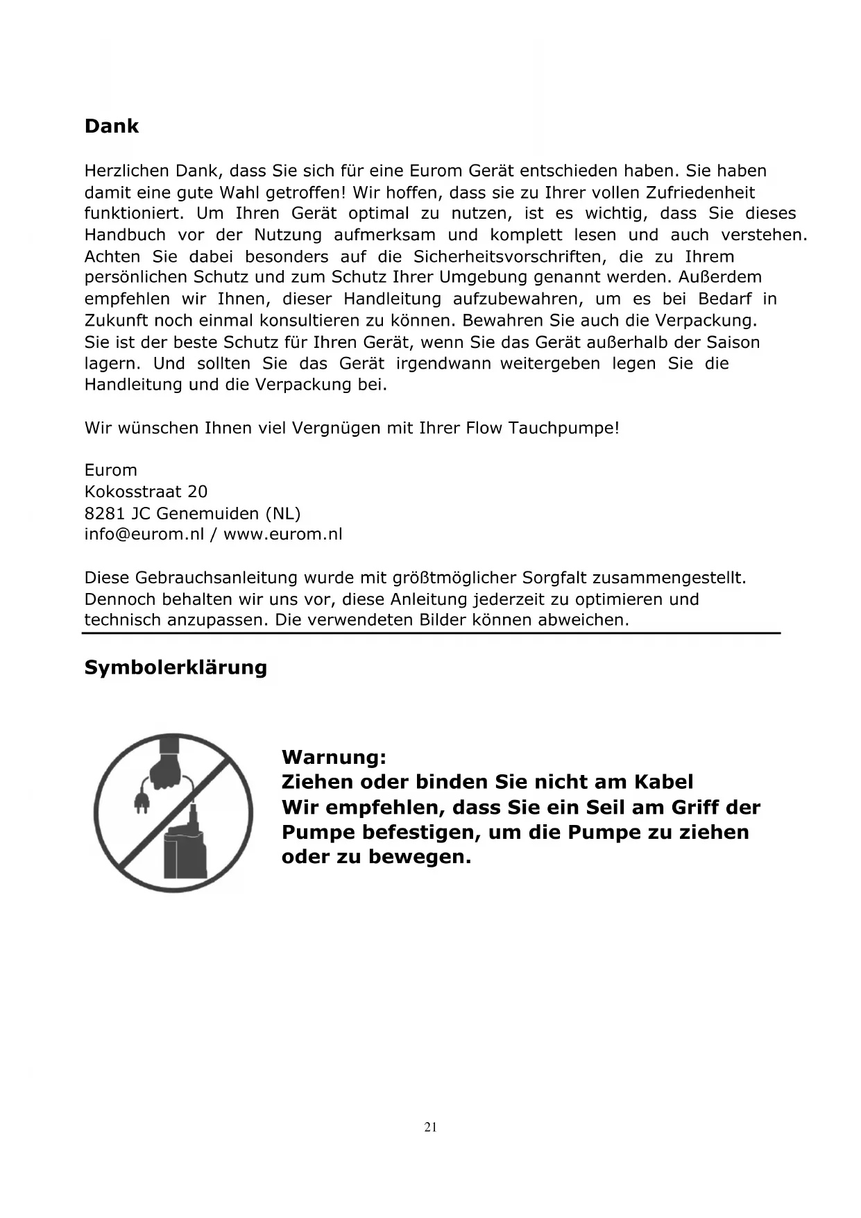 Guarantee The submersible pump you have purchased comes with the usual guarantee which applies to production and material defects. The following damage and defects are not covered by the guarantee: Wear and tear and defects in relation to mechanical seals caused by drying out or the presence of specific substances and/or objects in the water.20 Blockage of the blade by foreign objects Transport damage Damage caused by unreasonable use Defects that unauthorised persons have attempted to resolve or which have been caused by improper repairs Damage due to overheating The guarantee and liability of the supplier, importer and manufacturer will be nullified if the pump is opened by unauthorised persons or modifications or additions are made to the pump. Removal In the EU this symbol indicates that this product may not be disposed of as ordinary household waste. Old equipment contains valuable materials, suitable for recycling. These materials should be made suitable for reuse in order to prevent any adverse effects to health and the environment caused by unregulated waste collection. Therefore, please make sure that you bring old equipment to a designated collection point. Alternatively, contact the original supplier, who can make sure that as many of the components as possible can be recycled CE-declaration See page 74.21 Dank Herzlichen Dank, dass Sie sich für eine Eurom Gerät entschieden haben. Sie haben damit eine gute Wahl getroffen! Wir hoffen, dass sie zu Ihrer vollen Zufriedenheit funktioniert. Um Ihren Gerät optimal zu nutzen, ist es wichtig, dass Sie dieses Handbuch vor der Nutzung aufmerksam und komplett lesen und auch verstehen. Achten Sie dabei besonders auf die Sicherheitsvorschriften, die zu Ihrem persönlichen Schutz und zum Schutz Ihrer Umgebung genannt werden. Außerdem empfehlen wir Ihnen, dieser Handleitung aufzubewahren, um es bei Bedarf in Zukunft noch einmal konsultieren zu können. Bewahren Sie auch die Verpackung. Sie ist der beste Schutz für Ihren Gerät, wenn Sie das Gerät außerhalb der Saison lagern. Und sollten Sie das Gerät irgendwann weitergeben legen Sie die Handleitung und die Verpackung bei. Wir wünschen Ihnen viel Vergnügen mit Ihrer Flow Tauchpumpe! Eurom Kokosstraat 20 8281 JC Genemuiden (NL) info@eurom.nl / www.eurom.nl Diese Gebrauchsanleitung wurde mit größtmöglicher Sorgfalt zusammengestellt. Dennoch behalten wir uns vor, diese Anleitung jederzeit zu optimieren und technisch anzupassen. Die verwendeten Bilder können abweichen. Symbolerklärung