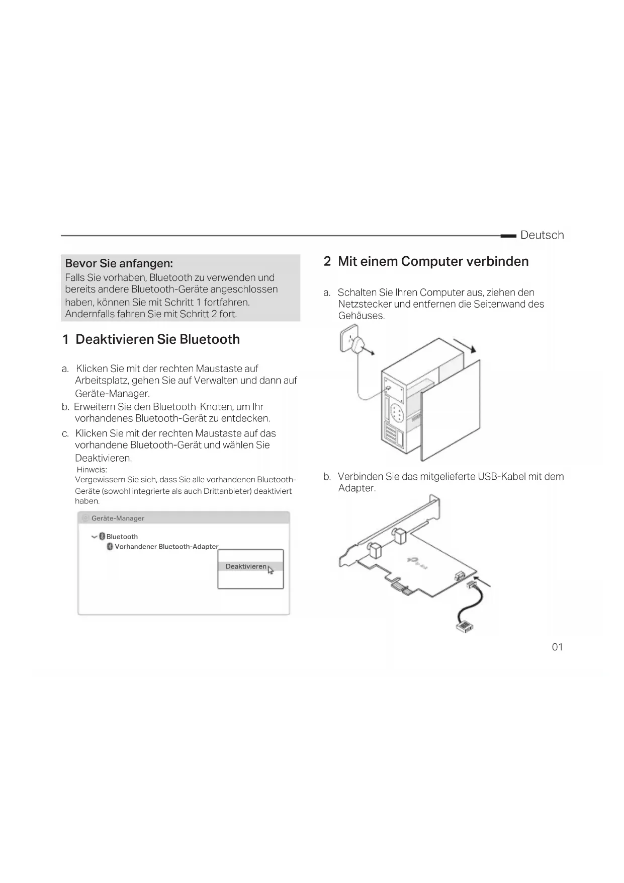 Quick Installation Guide WLAN Bluetooth PCI Express Adapter © 2023 TP-Link 7106510499 REV1.2.0 For technical support, the user guide and other information, please visit https://www.tp-link.com/support/CONTENTS 01 / Deutsch 04 / English 07 / Español 10 / Ελληνικά 13 / Français 16 / Italiano 19 / Português 22 / Suomi 25 / Nederlands 28 / Svenska 31 / Norsk 34 / Dansk01 Deutsch 2 Mit einem Computer verbinden a. Schalten Sie Ihren Computer aus, ziehen den Netzstecker und entfernen die Seitenwand des Gehäuses. b. Verbinden Sie das mitgelieferte USB-Kabel mit dem Adapter. 1 Deaktivieren Sie Bluetooth a. Klicken Sie mit der rechten Maustaste auf Arbeitsplatz, gehen Sie auf Verwalten und dann auf Geräte-Manager. b. Erweitern Sie den Bluetooth-Knoten, um Ihr vorhandenes Bluetooth-Gerät zu entdecken. c. Klicken Sie mit der rechten Maustaste auf das vorhandene Bluetooth-Gerät und wählen Sie Deaktivieren. Hinweis: Vergewissern Sie sich, dass Sie alle vorhandenen Bluetooth- Geräte (sowohl integrierte als auch Drittanbieter) deaktiviert haben. Bluetooth Geräte-Manager Deaktivieren Vorhandener Bluetooth-Adapter Bevor Sie anfangen: Falls Sie vorhaben, Bluetooth zu verwenden und bereits andere Bluetooth-Geräte angeschlossen haben, können Sie mit Schritt 1 fortfahren. Andernfalls fahren Sie mit Schritt 2 fort.Deutsch