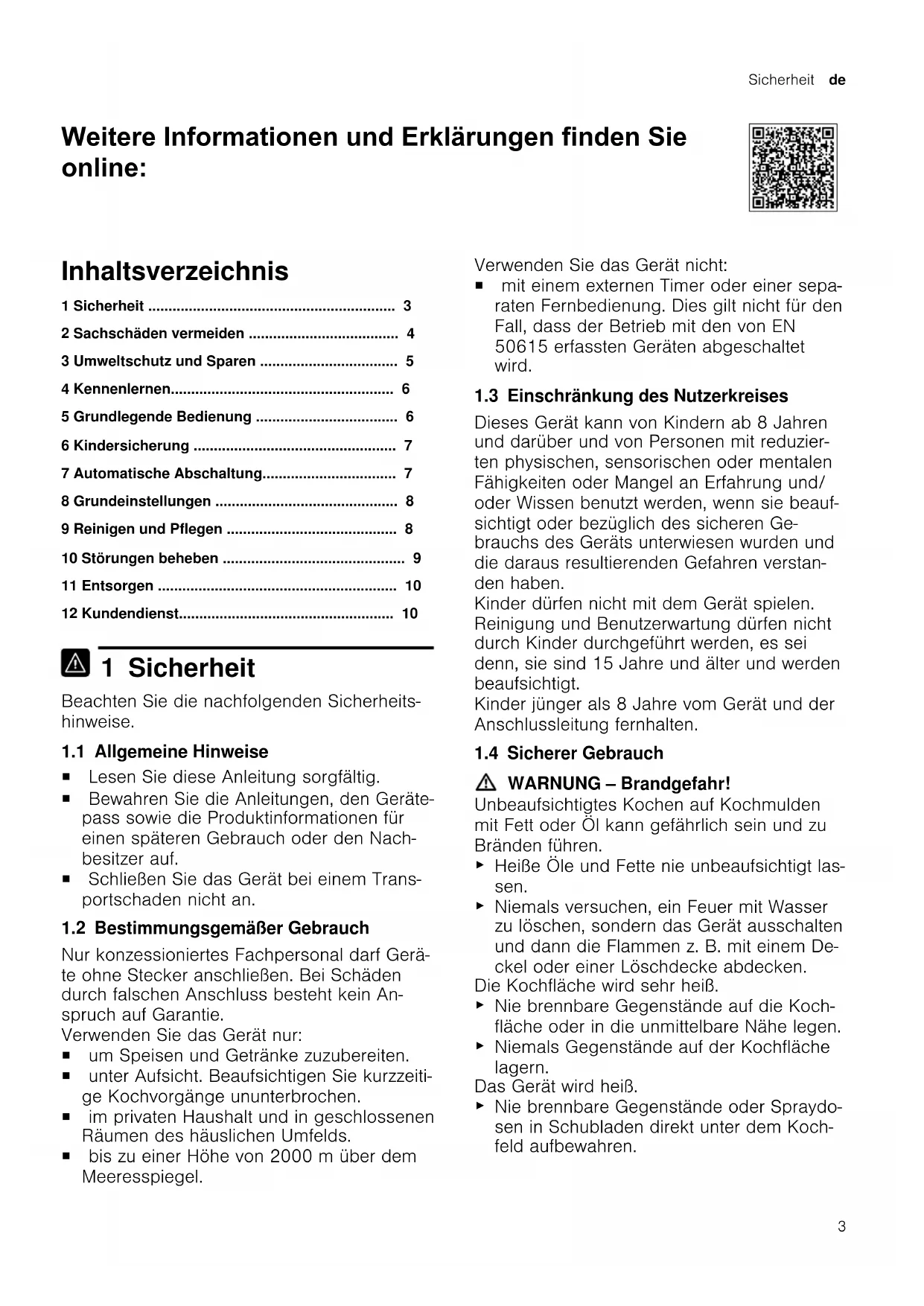 - 12 Kundendienst 1 Sicherheit Beachten Sie die nachfolgenden Sicherheits- hinweise. 1.1 Allgemeine Hinweise ¡ Lesen Sie diese Anleitung sorgfältig. ¡ Bewahren Sie die Anleitungen, den Geräte- pass sowie die Produktinformationen für einen späteren Gebrauch oder den Nach- besitzer auf. ¡ Schließen Sie das Gerät bei einem Trans- portschaden nicht an. 1.2 Bestimmungsgemäßer Gebrauch Nur konzessioniertes Fachpersonal darf Gerä- te ohne Stecker anschließen. Bei Schäden durch falschen Anschluss besteht kein An- spruch auf Garantie. Verwenden Sie das Gerät nur: ¡ um Speisen und Getränke zuzubereiten. ¡ unter Aufsicht. Beaufsichtigen Sie kurzzeiti- ge Kochvorgänge ununterbrochen. ¡ im privaten Haushalt und in geschlossenen Räumen des häuslichen Umfelds. ¡ bis zu einer Höhe von 2000m über dem Meeresspiegel. Verwenden Sie das Gerät nicht: ¡ mit einem externen Timer oder einer sepa- raten Fernbedienung. Dies gilt nicht für den Fall, dass der Betrieb mit den von EN 50615 erfassten Geräten abgeschaltet wird. 1.3 Einschränkung des Nutzerkreises Dieses Gerät kann von Kindern ab 8 Jahren und darüber und von Personen mit reduzier- ten physischen, sensorischen oder mentalen Fähigkeiten oder Mangel an Erfahrung und/ oder Wissen benutzt werden, wenn sie beauf- sichtigt oder bezüglich des sicheren Ge- brauchs des Geräts unterwiesen wurden und die daraus resultierenden Gefahren verstan- den haben. Kinder dürfen nicht mit dem Gerät spielen. Reinigung und Benutzerwartung dürfen nicht durch Kinder durchgeführt werden, es sei denn, sie sind 15 Jahre und älter und werden beaufsichtigt. Kinder jünger als 8 Jahre vom Gerät und der Anschlussleitung fernhalten. 1.4 Sicherer Gebrauch WARNUNG‒Brandgefahr! Unbeaufsichtigtes Kochen auf Kochmulden mit Fett oder Öl kann gefährlich sein und zu Bränden führen. p. 10