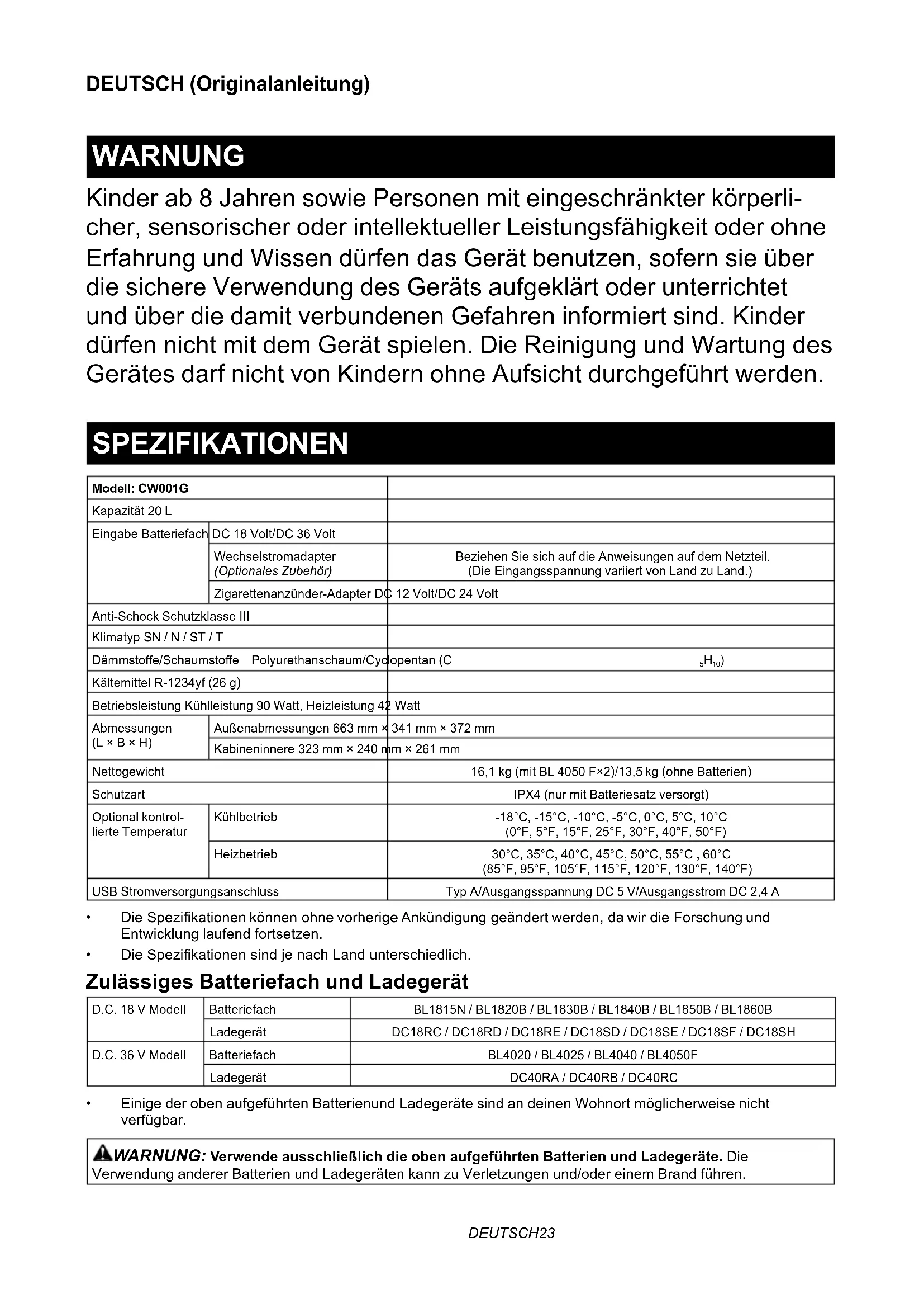 - BatterieetchargeurMakitad’origine REMARQUE : Certains articles de la liste peuvent êtreinclusdanslatroussedel’outilcommeacces- soiresstandard.Ilspeuventvarierd’unpaysàl’autre.DEUTSCH23 DEUTSCH (Originalanleitung) WARNUNG Kinder ab 8 Jahren sowie Personen mit eingeschränkter körperli- cher, sensorischer oder intellektueller Leistungsfähigkeit oder ohne Erfahrung und Wissen dürfen das Gerät benutzen, sofern sie über die sichere Verwendung des Geräts aufgeklärt oder unterrichtet und über die damit verbundenen Gefahren informiert sind. Kinder dürfen nicht mit dem Gerät spielen. Die Reinigung und Wartung des Gerätes darf nicht von Kindern ohne Aufsicht durchgeführt werden. SPEZIFIKATIONEN Modell: CW001GKapazität 20 LEingabe Batteriefach DC 18 Volt/DC 36 VoltWechselstromadapter (Optionales Zubehör)Beziehen Sie sich auf die Anweisungen auf dem Netzteil.(Die Eingangsspannung variiert von Land zu Land.)Zigarettenanzünder-Adapter DC 12 Volt/DC 24 VoltAnti-Schock Schutzklasse IIIKlimatyp SN / N / ST / TDämmstoe/Schaumstoe Polyurethanschaum/Cyclopentan (C
