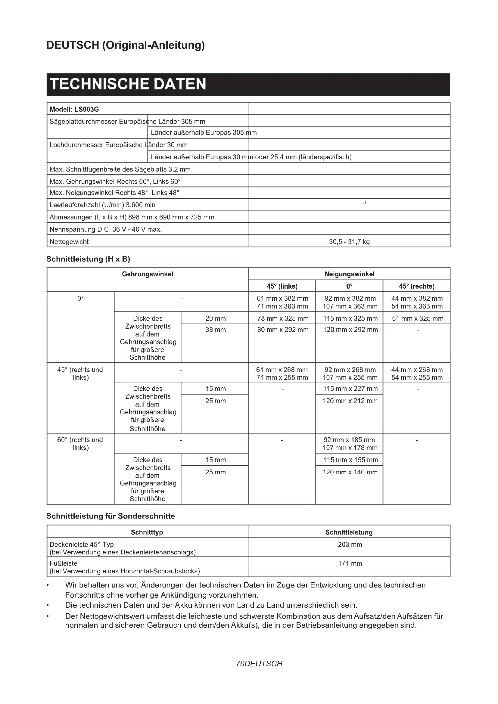 - Batterie et chargeur Makita d’origine NOTE : Il se peut que certains éléments de la liste soient compris dans l’emballage de l’outil en tant qu’accessoires standard. Ils peuvent varier d’un pays à l’autre.70 DEUTSCH DEUTSCH (Original-Anleitung) TECHNISCHE DATEN Modell: LS003G Sägeblattdurchmesser Europäische Länder 305 mm Länder außerhalb Europas 305 mm Lochdurchmesser Europäische Länder 30 mm Länder außerhalb Europas 30 mm oder 25,4 mm (länderspezisch) Max. Schnittfugenbreite des Sägeblatts 3,2 mm Max. Gehrungswinkel Rechts 60°, Links 60° Max. Neigungswinkel Rechts 48°, Links 48° Leerlaufdrehzahl (U/min) 3.600 min