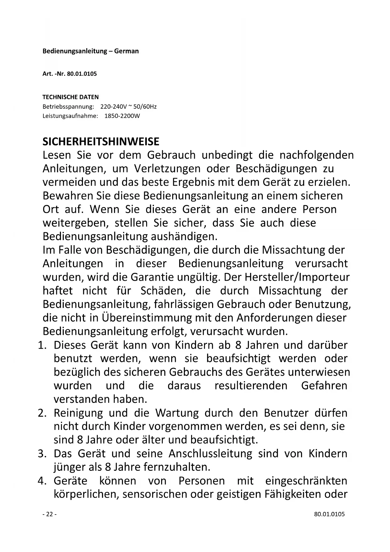 körperlichen, sensorischen oder geistigen Fähigkeiten oder- 23 - 80.01.0105 mit mangelnder Erfahrung und mangelnden Kenntnissen benutzt werden, wenn sie beaufsichtigt oder bezüglich des sicheren Genrauchs des Gerätes unterwiesen wurden und die damit verbundenen Gefahren verstanden haben.