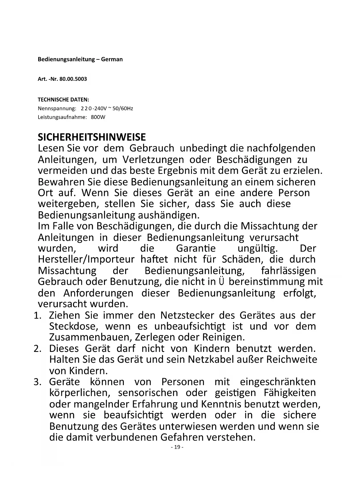 19. Dieses Gerät ist nicht für den gewerblichen Gebrauch