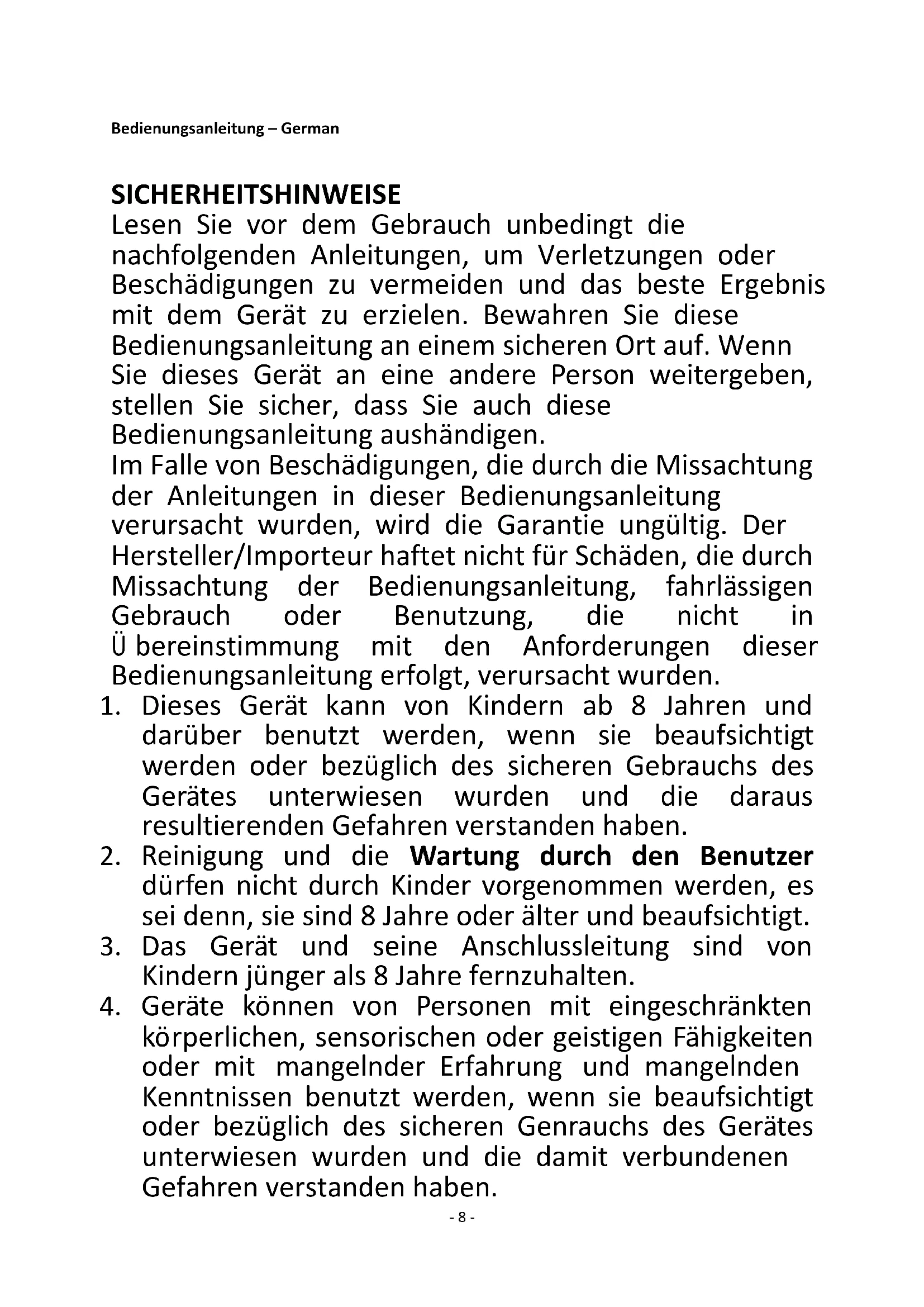 körperlichen, sensorischen oder geistigen Fähigkeiten oder mit mangelnder Erfahrung und mangelnden Kenntnissen benutzt werden, wenn sie beaufsichtigt oder bezüglich des sicheren Genrauchs des Gerätes unterwiesen wurden und die damit verbundenen Gefahren verstanden haben.- 9 -