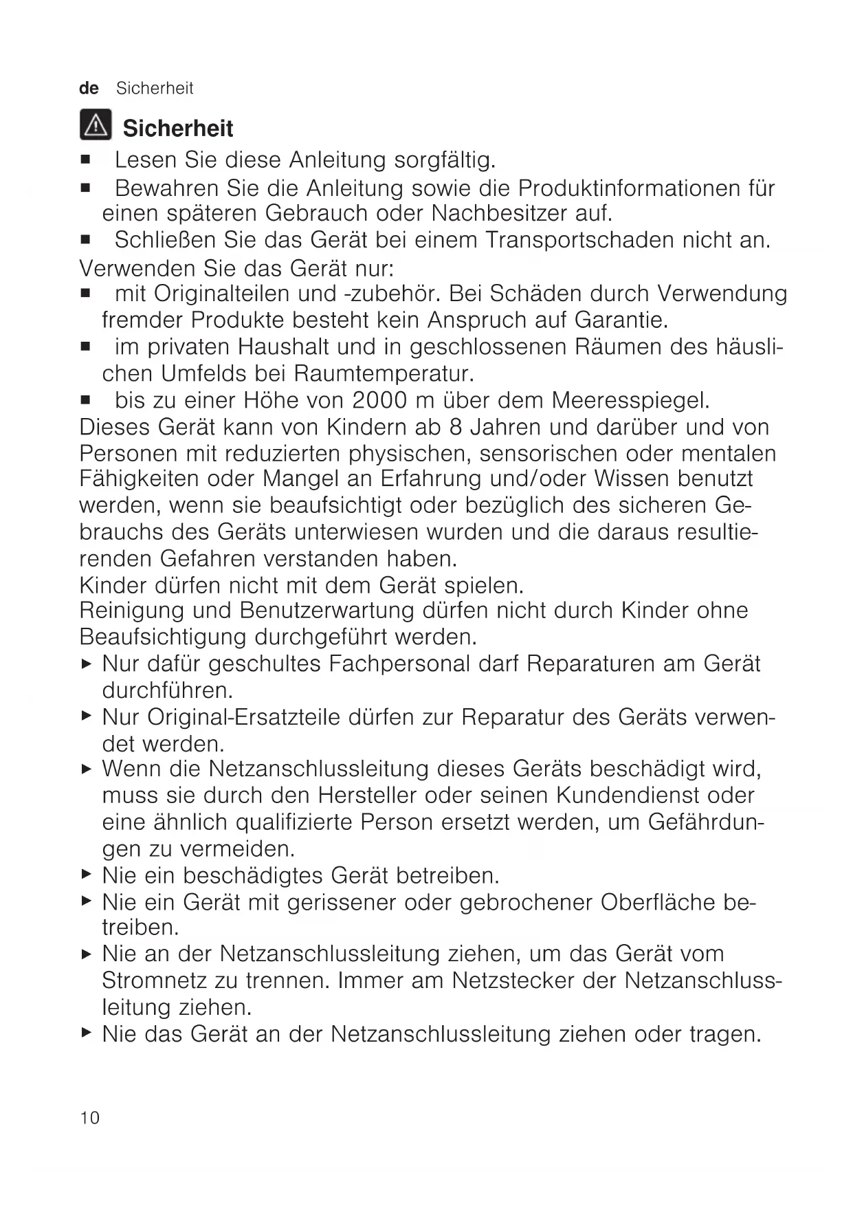 Sicherheit ¡ Lesen Sie diese Anleitung sorgfältig. ¡ Bewahren Sie die Anleitung sowie die Produktinformationen für einen späteren Gebrauch oder Nachbesitzer auf. ¡ Schließen Sie das Gerät bei einem Transportschaden nicht an. Verwenden Sie das Gerät nur: ¡ mit Originalteilen und -zubehör. Bei Schäden durch Verwendung fremder Produkte besteht kein Anspruch auf Garantie. ¡ im privaten Haushalt und in geschlossenen Räumen des häusli- chen Umfelds bei Raumtemperatur. ¡ bis zu einer Höhe von 2000m über dem Meeresspiegel. Dieses Gerät kann von Kindern ab 8 Jahren und darüber und von Personen mit reduzierten physischen, sensorischen oder mentalen Fähigkeiten oder Mangel an Erfahrung und/oder Wissen benutzt werden, wenn sie beaufsichtigt oder bezüglich des sicheren Ge- brauchs des Geräts unterwiesen wurden und die daraus resultie- renden Gefahren verstanden haben. Kinder dürfen nicht mit dem Gerät spielen. Reinigung und Benutzerwartung dürfen nicht durch Kinder ohne Beaufsichtigung durchgeführt werden.