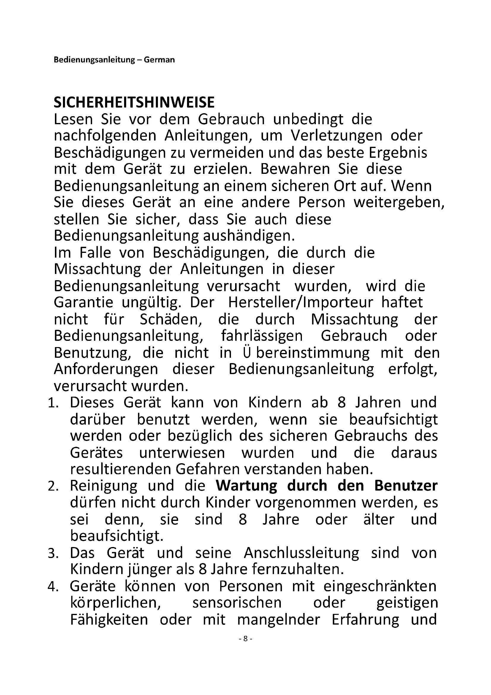1. Dieses Gerät kann von Kindern ab 8 Jahren und