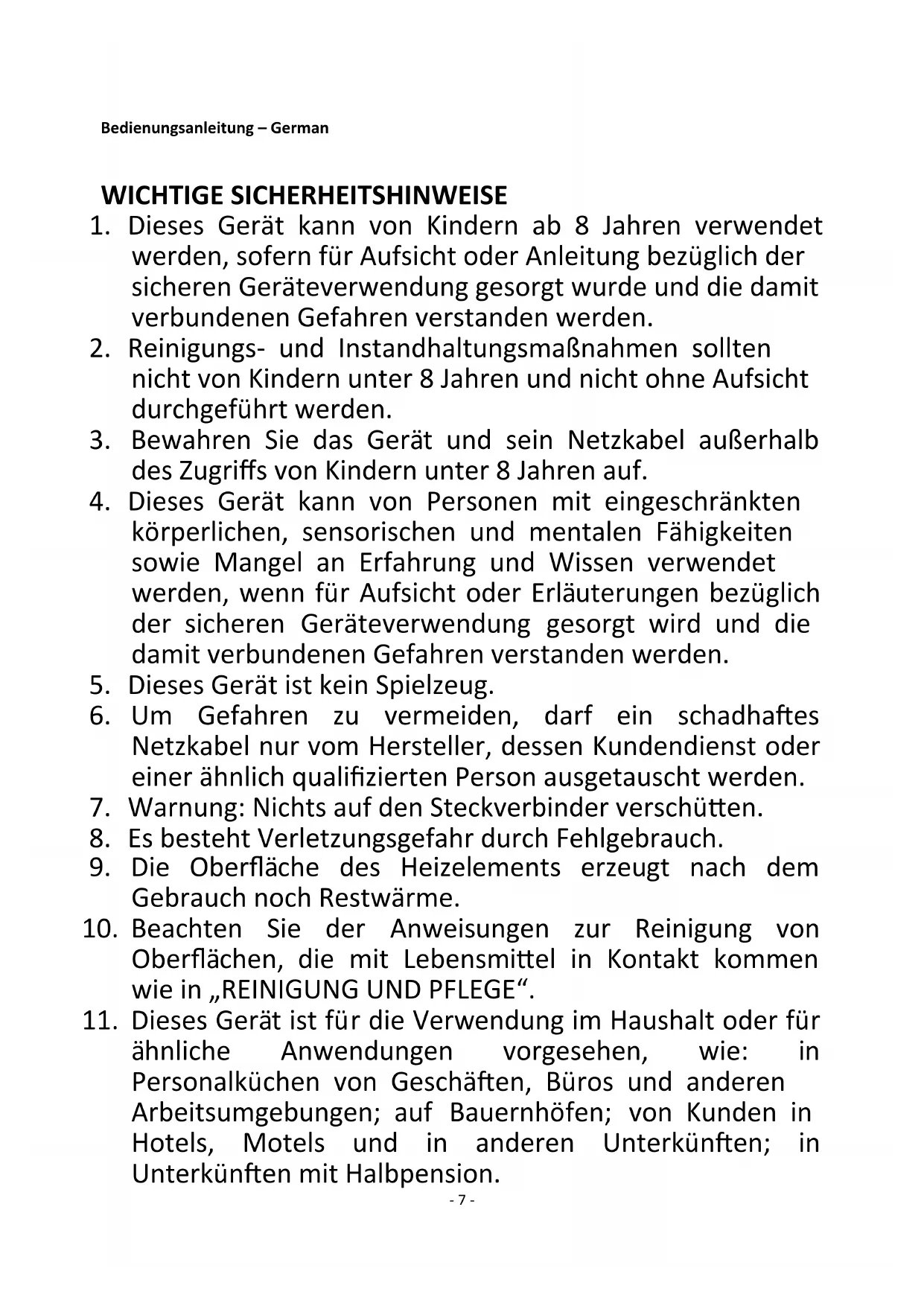 11. Dieses Gerät ist für die Verwendung im Haushalt oder für
