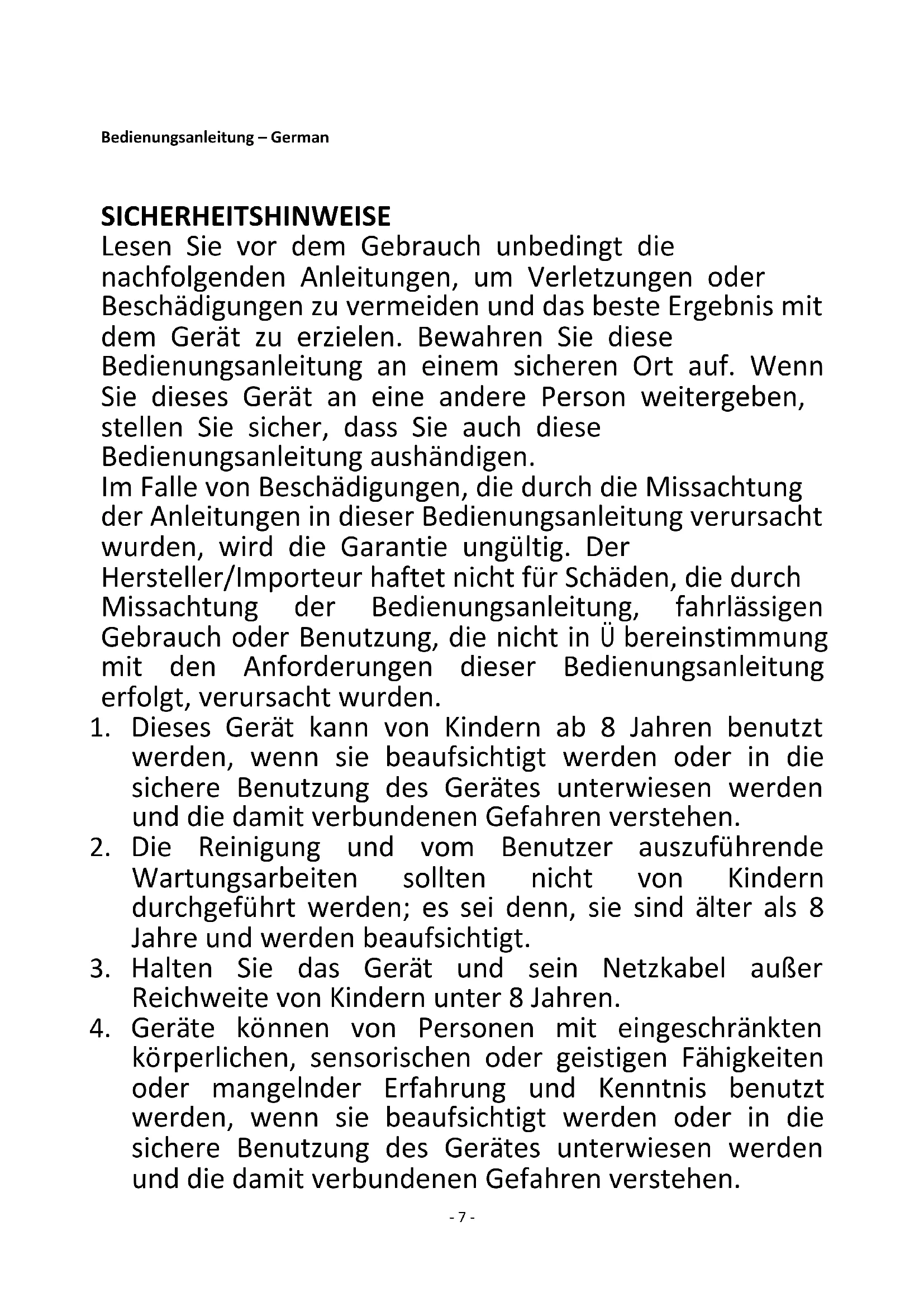 körperlichen, sensorischen oder geistigen Fähigkeiten oder mangelnder Erfahrung und Kenntnis benutzt werden, wenn sie beaufsichtigt werden oder in die sichere Benutzung des Gerätes unterwiesen werden und die damit verbundenen Gefahren verstehen.- 8 -