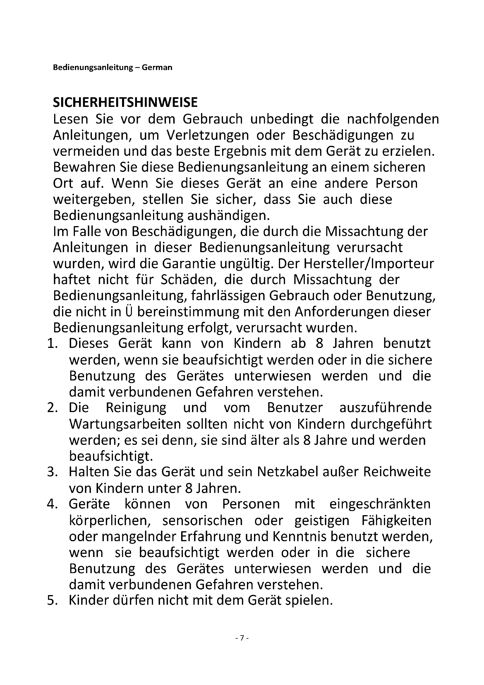 5. Kinder dürfen nicht mit dem Gerät spielen.- 8 -