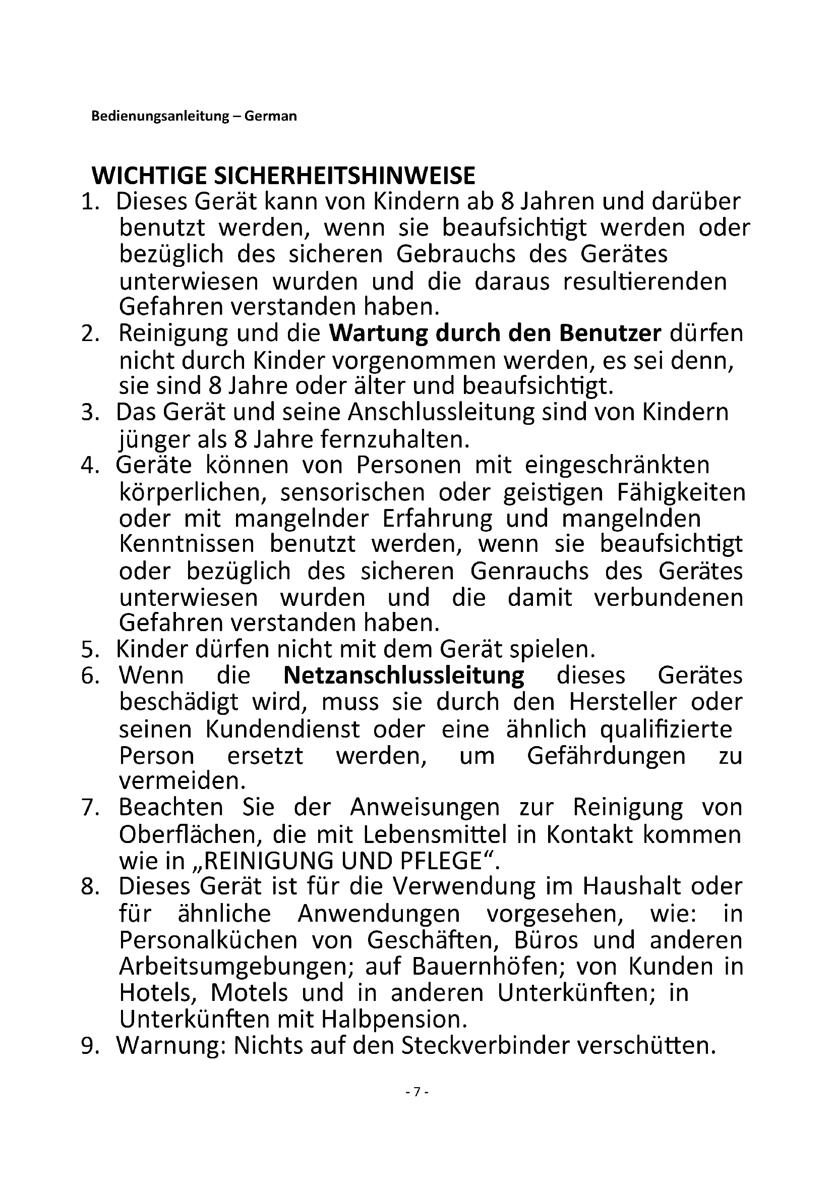 8. Dieses Gerät ist für die Verwendung im Haushalt oder
