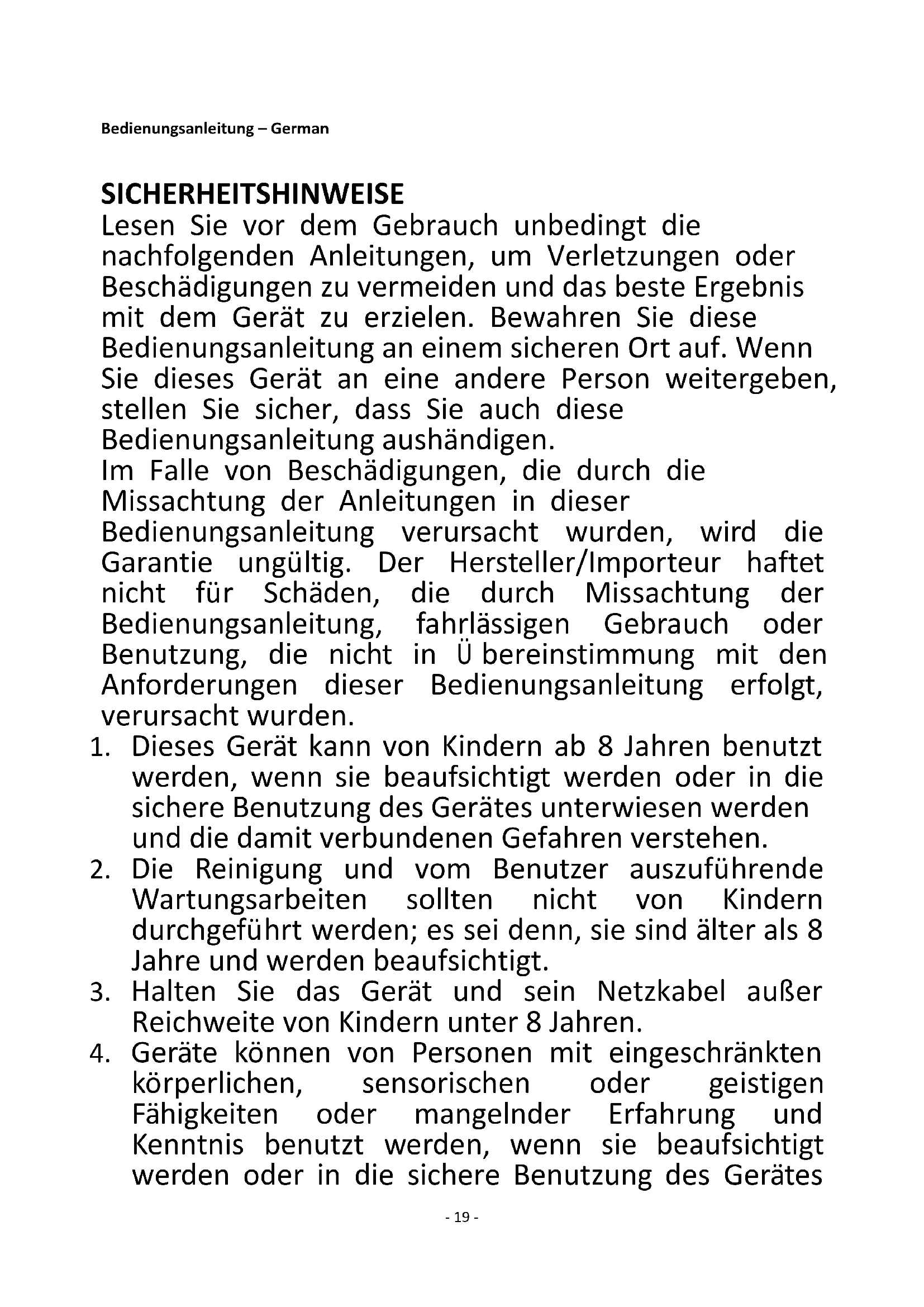 körperlichen, sensorischen oder geistigen Fähigkeiten oder mangelnder Erfahrung und Kenntnis benutzt werden, wenn sie beaufsichtigt werden oder in die sichere Benutzung des Gerätes- 20 - unterwiesen werden und die damit verbundenen Gefahren verstehen.