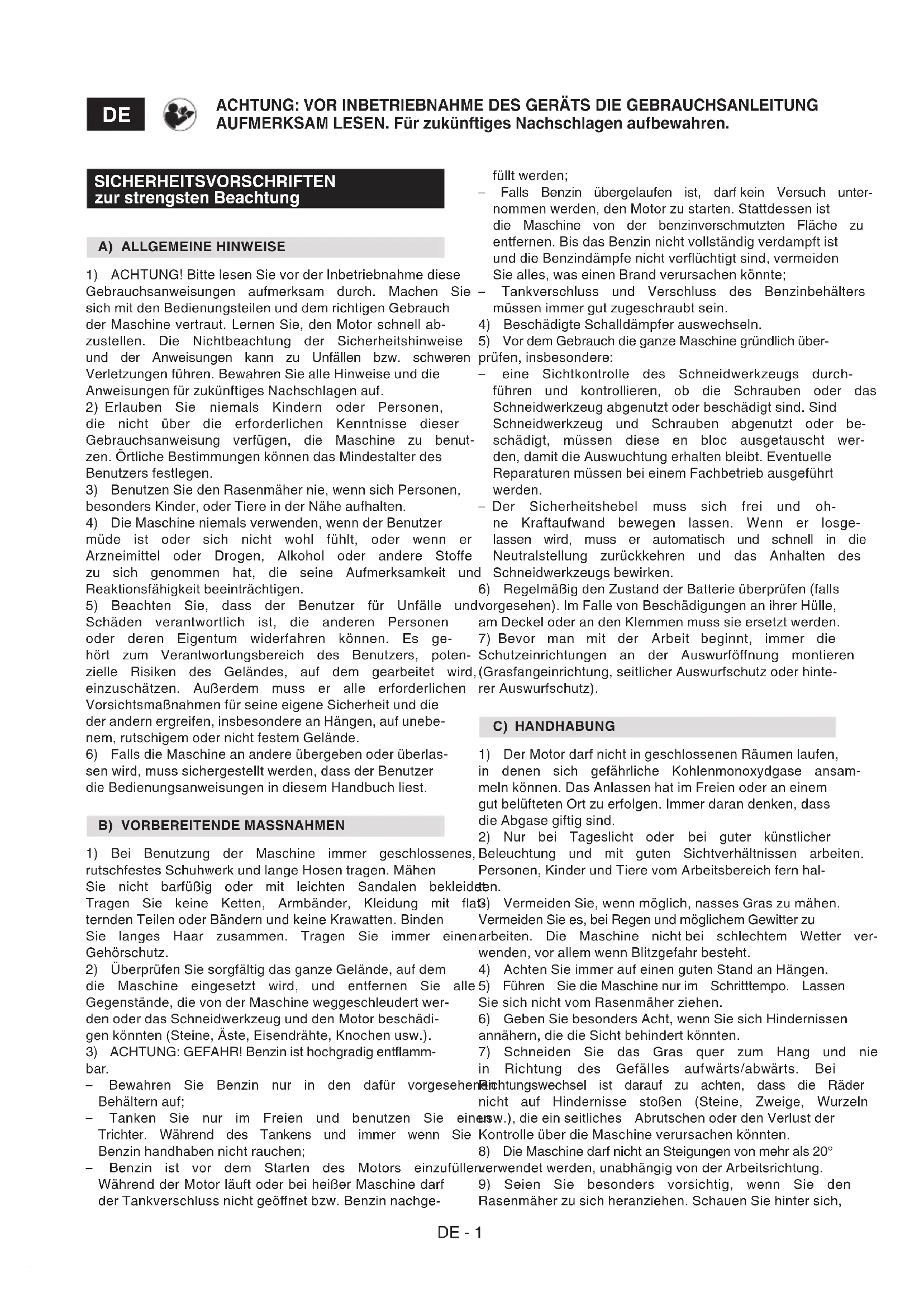 ACHTUNG: VOR INBETRIEBNAHME DES GERÄTS DIE GEBRAUCHSANLEITUNG AUFMERKSAM LESEN. Für zukünftiges Nachschlagen aufbewahren. füllt werden; – Falls Benzin übergelaufen ist, darf kein Versuch unter- nommen werden, den Motor zu starten. Stattdessen ist die Maschine von der benzinverschmutzten Fläche zu entfernen. Bis das Benzin nicht vollständig verdampft ist und die Benzindämpfe nicht verüchtigt sind, vermeiden Sie alles, was einen Brand verursachen könnte; – Tankverschluss und Verschluss des Benzinbehälters müssen immer gut zugeschraubt sein. 4) Beschädigte Schalldämpfer auswechseln. 5) Vor dem Gebrauch die ganze Maschine gründlich über- prüfen, insbesondere: – eine Sichtkontrolle des Schneidwerkzeugs durch- führen und kontrollieren, ob die Schrauben oder das Schneidwerkzeug abgenutzt oder beschädigt sind. Sind Schneidwerkzeug und Schrauben abgenutzt oder be- schädigt, müssen diese en bloc ausgetauscht wer- den, damit die Auswuchtung erhalten bleibt. Eventuelle Reparaturen müssen bei einem Fachbetrieb ausgeführt werden. – Der Sicherheitshebel muss sich frei und oh- ne Kraftaufwand bewegen lassen. Wenn er losge- lassen wird, muss er automatisch und schnell in die Neutralstellung zurückkehren und das Anhalten des Schneidwerkzeugs bewirken. 6) Regelmäßig den Zustand der Batterie überprüfen (falls vorgesehen). Im Falle von Beschädigungen an ihrer Hülle, am Deckel oder an den Klemmen muss sie ersetzt werden. 7) Bevor man mit der Arbeit beginnt, immer die Schutzeinrichtungen an der Auswurfönung montieren (Grasfangeinrichtung, seitlicher Auswurfschutz oder hinte- rer Auswurfschutz). C) HANDHABUNG 1) Der Motor darf nicht in geschlossenen Räumen laufen, in denen sich gefährliche Kohlenmonoxydgase ansam- meln können. Das Anlassen hat im Freien oder an einem gut belüfteten Ort zu erfolgen. Immer daran denken, dass die Abgase giftig sind. 2) Nur bei Tageslicht oder bei guter künstlicher Beleuchtung und mit guten Sichtverhältnissen arbeiten. Personen, Kinder und Tiere vom Arbeitsbereich fern hal- ten. 3) Vermeiden Sie, wenn möglich, nasses Gras zu mähen. Vermeiden Sie es, bei Regen und möglichem Gewitter zu arbeiten. Die Maschine nicht bei schlechtem Wetter ver- wenden, vor allem wenn Blitzgefahr besteht. 4) Achten Sie immer auf einen guten Stand an Hängen. 5) Führen Sie die Maschine nur im Schritttempo. Lassen Sie sich nicht vom Rasenmäher ziehen. 6) Geben Sie besonders Acht, wenn Sie sich Hindernissen annähern, die die Sicht behindert könnten. 7) Schneiden Sie das Gras quer zum Hang und nie in Richtung des Gefälles aufwärts/abwärts. Bei Richtungswechsel ist darauf zu achten, dass die Räder nicht auf Hindernisse stoßen (Steine, Zweige, Wurzeln usw.), die ein seitliches Abrutschen oder den Verlust der Kontrolle über die Maschine verursachen könnten. 8) Die Maschine darf nicht an Steigungen von mehr als 20° verwendet werden, unabhängig von der Arbeitsrichtung. 9) Seien Sie besonders vorsichtig, wenn Sie den Rasenmäher zu sich heranziehen. Schauen Sie hinter sich,DE - 2 bevor Sie in den Rückwärtsgang schalten und während Sie zurücksetzen, um sicherzustellen, dass keine Hindernisse vorhanden sind. 10) Halten Sie das Schneidwerkzeug an, wenn der Mäher beim Transport über andere Flächen als Gras zu kippen ist und wenn Sie den Rasenmäher zur Mähäche hin- und wie- der abtransportieren. 11) Wenn Sie die Maschine in der Nähe der Straße ver- wenden, achten Sie auf den Verkehr. 12) Verwenden Sie die Maschine nie mit beschädigten Schutzeinrichtungen oder ohne die Grasfangeinrichtung, den seitlichen oder den hinteren Auswurfschutz. 13) In der Nähe von abschüssigen Stellen, Gräben oder Dämmen besonders vorsichtig sein. 14) Starten Sie den Motor mit Vorsicht entsprechend den Anweisungen. Achten Sie auf ausreichenden Abstand der Füße zum Schneidwerkzeug. 15) Den Rasenmäher beim Start des Motors nicht kip- pen. Starten Sie den Motor auf einer ebenen Fläche ohne Hindernisse oder hohes Gras. 16) Bringen Sie niemals Hände oder Füße in die Nähe von sich drehenden Teilen. Halten Sie sich immer entfernt von der Auswurfönung. 17) Heben oder tragen Sie den Rasenmäher nie mit lau- fendem Motor. 18) Die Sicherheitssysteme nicht entfernen oder außer Betrieb setzen. 19) Ändern Sie nicht die Grundeinstellung des Motors und lassen Sie ihn nicht überdrehen. 20) Die Komponenten des Motors, die sich während des Gebrauchs erhitzen, nicht berühren. Es besteht Verbrennungsgefahr. 21) Bei den Modellen mit Motorantrieb, lösen sie die Kupplung des Radantriebs, bevor Sie den Motor starten. 22) Verwenden Sie ausschließlich vom Hersteller der Maschine genehmigte Zubehörteile. 23) Die Maschine nicht verwenden, wenn das Zubehör/ die Werkzeuge nicht in den vorgesehenen Punkten ins- talliert sind. 24) Das Schneidwerkzeug ausschalten, den Motor anhal- ten und das Kabel der Zündkerze abziehen (sicherstellen, dass alle beweglichen Teile vollkommen stillstehen): – Während des Transports der Maschine; – Wenn Sie die Maschine unbewacht lassen. Bei den Modellen mit elektrischem Anlasser, den Zündschlüssel abziehen; – Bevor Sie Verstopfungen beseitigen oder den Auswurfkanal reinigen; – Bevor Sie die Maschine überprüfen, reinigen oder Arbeiten an ihr durchführen; – Nachdem ein Fremdkörper getroen wurde. Prüfen Sie, ob Schäden an der Maschine entstanden sind, und füh- ren Sie die erforderlichen Reparaturen aus, bevor Sie die Maschine wieder benutzen. 25) Das Schneidwerkzeug ausschalten und den Motor anhalten: – Bevor Sie nachtanken; – Jedes Mal, wenn die Grasfangeinrichtung abgenommen oder wieder montiert wird; – Jedes Mal, wenn der seitliche Auswurfdeektor abge- nommen oder wieder montiert wird; – Bevor man die Schnitthöhe einstellt, falls dies nicht vom Fahrersitz aus erfolgen kann. 26) Halten Sie während der Arbeit stets einen Sicherheitsabstand vom rotierenden Schneidwerkzeug. Dieser Abstand entspricht der Länge des Handgris. 2