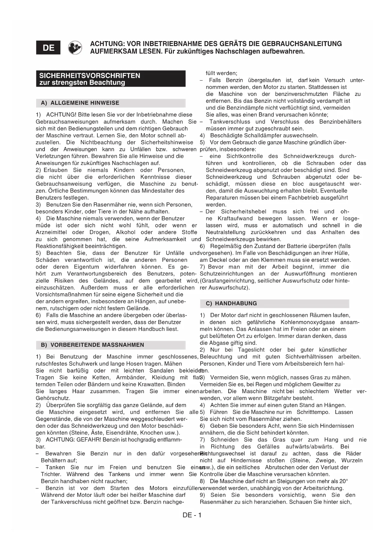 ACHTUNG: VOR INBETRIEBNAHME DES GERÄTS DIE GEBRAUCHSANLEITUNG AUFMERKSAM LESEN. Für zukünftiges Nachschlagen aufbewahren. füllt werden; – Falls Benzin übergelaufen ist, darf kein Versuch unter- nommen werden, den Motor zu starten. Stattdessen ist die Maschine von der benzinverschmutzten Fläche zu entfernen. Bis das Benzin nicht vollständig verdampft ist und die Benzindämpfe nicht verüchtigt sind, vermeiden Sie alles, was einen Brand verursachen könnte; – Tankverschluss und Verschluss des Benzinbehälters müssen immer gut zugeschraubt sein. 4) Beschädigte Schalldämpfer auswechseln. 5) Vor dem Gebrauch die ganze Maschine gründlich über- prüfen, insbesondere: – eine Sichtkontrolle des Schneidwerkzeugs durch- führen und kontrollieren, ob die Schrauben oder das Schneidwerkzeug abgenutzt oder beschädigt sind. Sind Schneidwerkzeug und Schrauben abgenutzt oder be- schädigt, müssen diese en bloc ausgetauscht wer- den, damit die Auswuchtung erhalten bleibt. Eventuelle Reparaturen müssen bei einem Fachbetrieb ausgeführt werden. – Der Sicherheitshebel muss sich frei und oh- ne Kraftaufwand bewegen lassen. Wenn er losge- lassen wird, muss er automatisch und schnell in die Neutralstellung zurückkehren und das Anhalten des Schneidwerkzeugs bewirken. 6) Regelmäßig den Zustand der Batterie überprüfen (falls vorgesehen). Im Falle von Beschädigungen an ihrer Hülle, am Deckel oder an den Klemmen muss sie ersetzt werden. 7) Bevor man mit der Arbeit beginnt, immer die Schutzeinrichtungen an der Auswurfönung montieren (Grasfangeinrichtung, seitlicher Auswurfschutz oder hinte- rer Auswurfschutz). C) HANDHABUNG 1) Der Motor darf nicht in geschlossenen Räumen laufen, in denen sich gefährliche Kohlenmonoxydgase ansam- meln können. Das Anlassen hat im Freien oder an einem gut belüfteten Ort zu erfolgen. Immer daran denken, dass die Abgase giftig sind. 2) Nur bei Tageslicht oder bei guter künstlicher Beleuchtung und mit guten Sichtverhältnissen arbeiten. Personen, Kinder und Tiere vom Arbeitsbereich fern hal- ten. 3) Vermeiden Sie, wenn möglich, nasses Gras zu mähen. Vermeiden Sie es, bei Regen und möglichem Gewitter zu arbeiten. Die Maschine nicht bei schlechtem Wetter ver- wenden, vor allem wenn Blitzgefahr besteht. 4) Achten Sie immer auf einen guten Stand an Hängen. 5) Führen Sie die Maschine nur im Schritttempo. Lassen Sie sich nicht vom Rasenmäher ziehen. 6) Geben Sie besonders Acht, wenn Sie sich Hindernissen annähern, die die Sicht behindert könnten. 7) Schneiden Sie das Gras quer zum Hang und nie in Richtung des Gefälles aufwärts/abwärts. Bei Richtungswechsel ist darauf zu achten, dass die Räder nicht auf Hindernisse stoßen (Steine, Zweige, Wurzeln usw.), die ein seitliches Abrutschen oder den Verlust der Kontrolle über die Maschine verursachen könnten. 8) Die Maschine darf nicht an Steigungen von mehr als 20° verwendet werden, unabhängig von der Arbeitsrichtung. 9) Seien Sie besonders vorsichtig, wenn Sie den Rasenmäher zu sich heranziehen. Schauen Sie hinter sich,DE - 2 bevor Sie in den Rückwärtsgang schalten und während Sie zurücksetzen, um sicherzustellen, dass keine Hindernisse vorhanden sind. 10) Halten Sie das Schneidwerkzeug an, wenn der Mäher beim Transport über andere Flächen als Gras zu kippen ist und wenn Sie den Rasenmäher zur Mähäche hin- und wie- der abtransportieren. 11) Wenn Sie die Maschine in der Nähe der Straße ver- wenden, achten Sie auf den Verkehr. 12) Verwenden Sie die Maschine nie mit beschädigten Schutzeinrichtungen oder ohne die Grasfangeinrichtung, den seitlichen oder den hinteren Auswurfschutz. 13) In der Nähe von abschüssigen Stellen, Gräben oder Dämmen besonders vorsichtig sein. 14) Starten Sie den Motor mit Vorsicht entsprechend den Anweisungen. Achten Sie auf ausreichenden Abstand der Füße zum Schneidwerkzeug. 15) Den Rasenmäher beim Start des Motors nicht kip- pen. Starten Sie den Motor auf einer ebenen Fläche ohne Hindernisse oder hohes Gras. 16) Bringen Sie niemals Hände oder Füße in die Nähe von sich drehenden Teilen. Halten Sie sich immer entfernt von der Auswurfönung. 17) Heben oder tragen Sie den Rasenmäher nie mit lau- fendem Motor. 18) Die Sicherheitssysteme nicht entfernen oder außer Betrieb setzen. 19) Ändern Sie nicht die Grundeinstellung des Motors und lassen Sie ihn nicht überdrehen. 20) Die Komponenten des Motors, die sich während des Gebrauchs erhitzen, nicht berühren. Es besteht Verbrennungsgefahr. 21) Bei den Modellen mit Motorantrieb, lösen sie die Kupplung des Radantriebs, bevor Sie den Motor starten. 22) Verwenden Sie ausschließlich vom Hersteller der Maschine genehmigte Zubehörteile. 23) Die Maschine nicht verwenden, wenn das Zubehör/ die Werkzeuge nicht in den vorgesehenen Punkten ins- talliert sind. 24) Das Schneidwerkzeug ausschalten, den Motor anhal- ten und das Kabel der Zündkerze abziehen (sicherstellen, dass alle beweglichen Teile vollkommen stillstehen): – Während des Transports der Maschine; – Wenn Sie die Maschine unbewacht lassen. Bei den Modellen mit elektrischem Anlasser, den Zündschlüssel abziehen; – Bevor Sie Verstopfungen beseitigen oder den Auswurfkanal reinigen; – Bevor Sie die Maschine überprüfen, reinigen oder Arbeiten an ihr durchführen; – Nachdem ein Fremdkörper getroen wurde. Prüfen Sie, ob Schäden an der Maschine entstanden sind, und füh- ren Sie die erforderlichen Reparaturen aus, bevor Sie die Maschine wieder benutzen. 25) Das Schneidwerkzeug ausschalten und den Motor anhalten: – Bevor Sie nachtanken; – Jedes Mal, wenn die Grasfangeinrichtung abgenommen oder wieder montiert wird; – Jedes Mal, wenn der seitliche Auswurfdeektor abge- nommen oder wieder montiert wird; – Bevor man die Schnitthöhe einstellt, falls dies nicht vom Fahrersitz aus erfolgen kann. 26) Halten Sie während der Arbeit stets einen Sicherheitsabstand vom rotierenden Schneidwerkzeug. Dieser Abstand entspricht der Länge des Handgris. 2