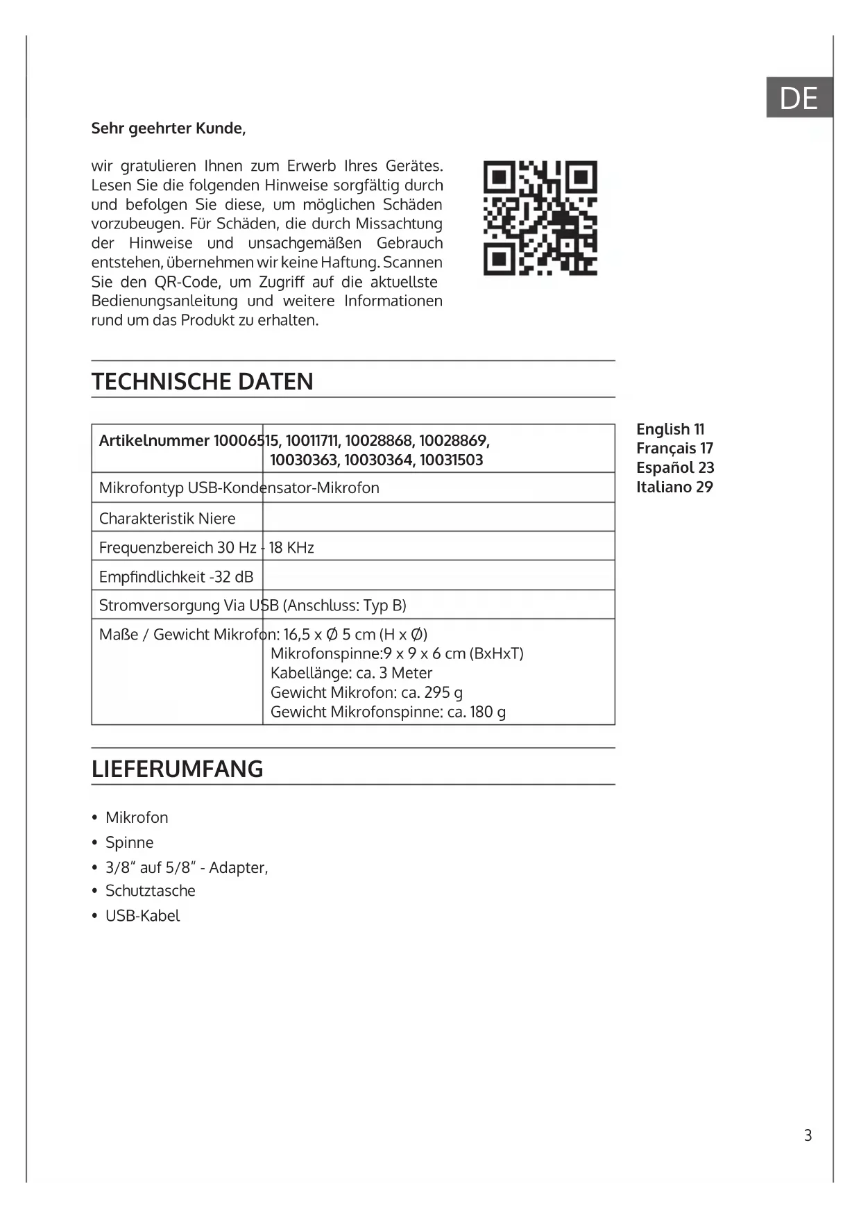 Sehr geehrter Kunde, wir gratulieren Ihnen zum Erwerb Ihres Gerätes. Lesen Sie die folgenden Hinweise sorgfältig durch und befolgen Sie diese, um möglichen Schäden vorzubeugen. Für Schäden, die durch Missachtung der Hinweise und unsachgemäßen Gebrauch entstehen, übernehmen wir keine Haftung. Scannen Sie den QR-Code, um Zugri auf die aktuellste Bedienungsanleitung und weitere Informationen rund um das Produkt zu erhalten. TECHNISCHE DATEN Artikelnummer 10006515, 10011711, 10028868, 10028869, 10030363, 10030364, 10031503 Mikrofontyp USB-Kondensator-Mikrofon Charakteristik Niere Frequenzbereich 30 Hz - 18 KHz Empndlichkeit -32 dB Stromversorgung Via USB (Anschluss: Typ B) Maße / Gewicht Mikrofon: 16,5 x Ø 5 cm (H x Ø) Mikrofonspinne:9 x 9 x 6 cm (BxHxT) Kabellänge: ca. 3 Meter Gewicht Mikrofon: ca. 295g Gewicht Mikrofonspinne: ca. 180g LIEFERUMFANG