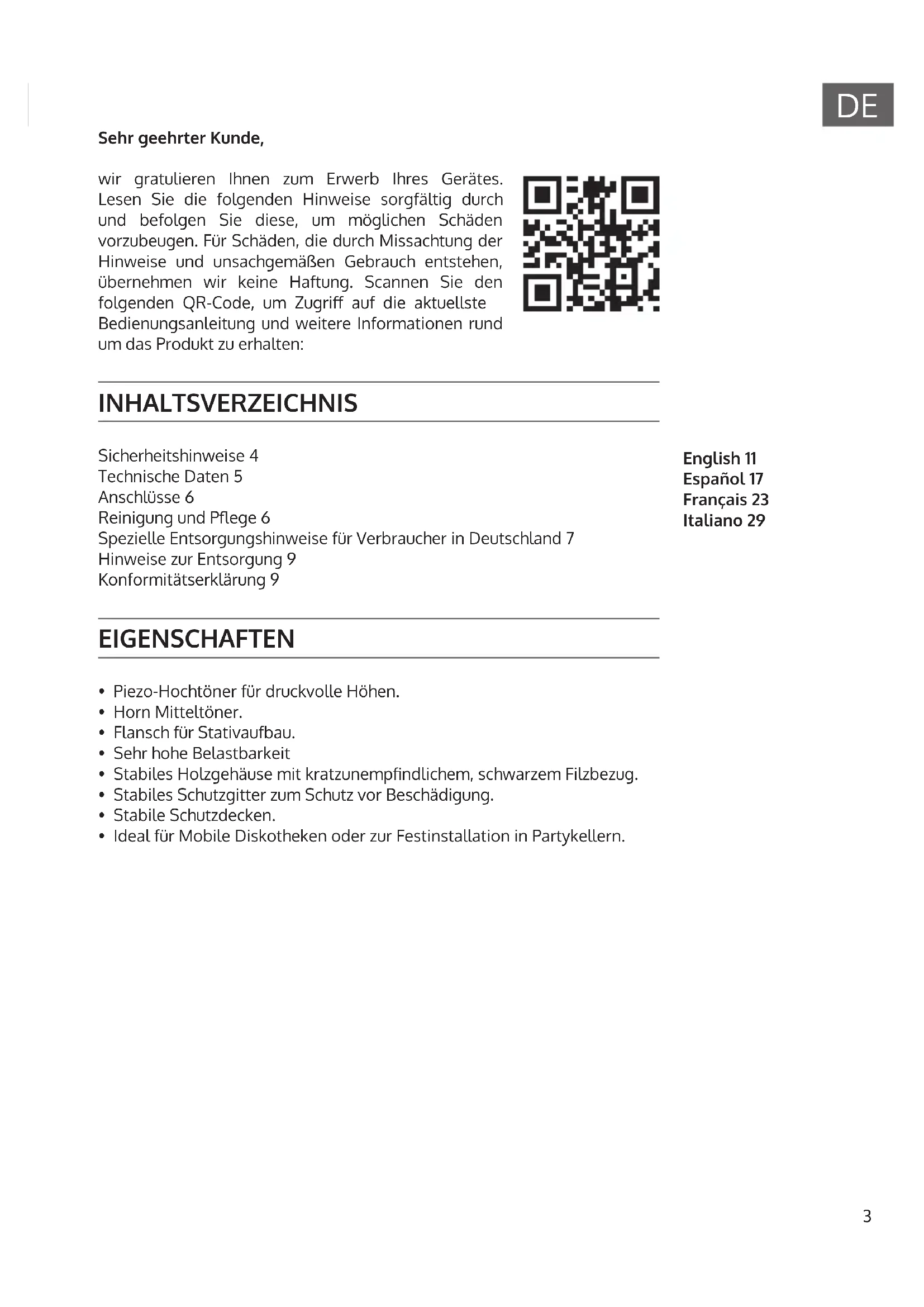 English 11 Español 17 Français 23 Italiano 29 Sehr geehrter Kunde, wir gratulieren Ihnen zum Erwerb Ihres Gerätes. Lesen Sie die folgenden Hinweise sorgfältig durch und befolgen Sie diese, um möglichen Schäden vorzubeugen. Für Schäden, die durch Missachtung der Hinweise und unsachgemäßen Gebrauch entstehen, übernehmen wir keine Haftung. Scannen Sie den folgenden QR-Code, um Zugri auf die aktuellste Bedienungsanleitung und weitere Informationen rund um das Produkt zu erhalten: INHALTSVERZEICHNIS Sicherheitshinweise 4 Technische Daten 5 Anschlüsse 6 Reinigung und Pege 6 Spezielle Entsorgungshinweise für Verbraucher in Deutschland 7 Hinweise zur Entsorgung 9 Konformitätserklärung 9 EIGENSCHAFTEN