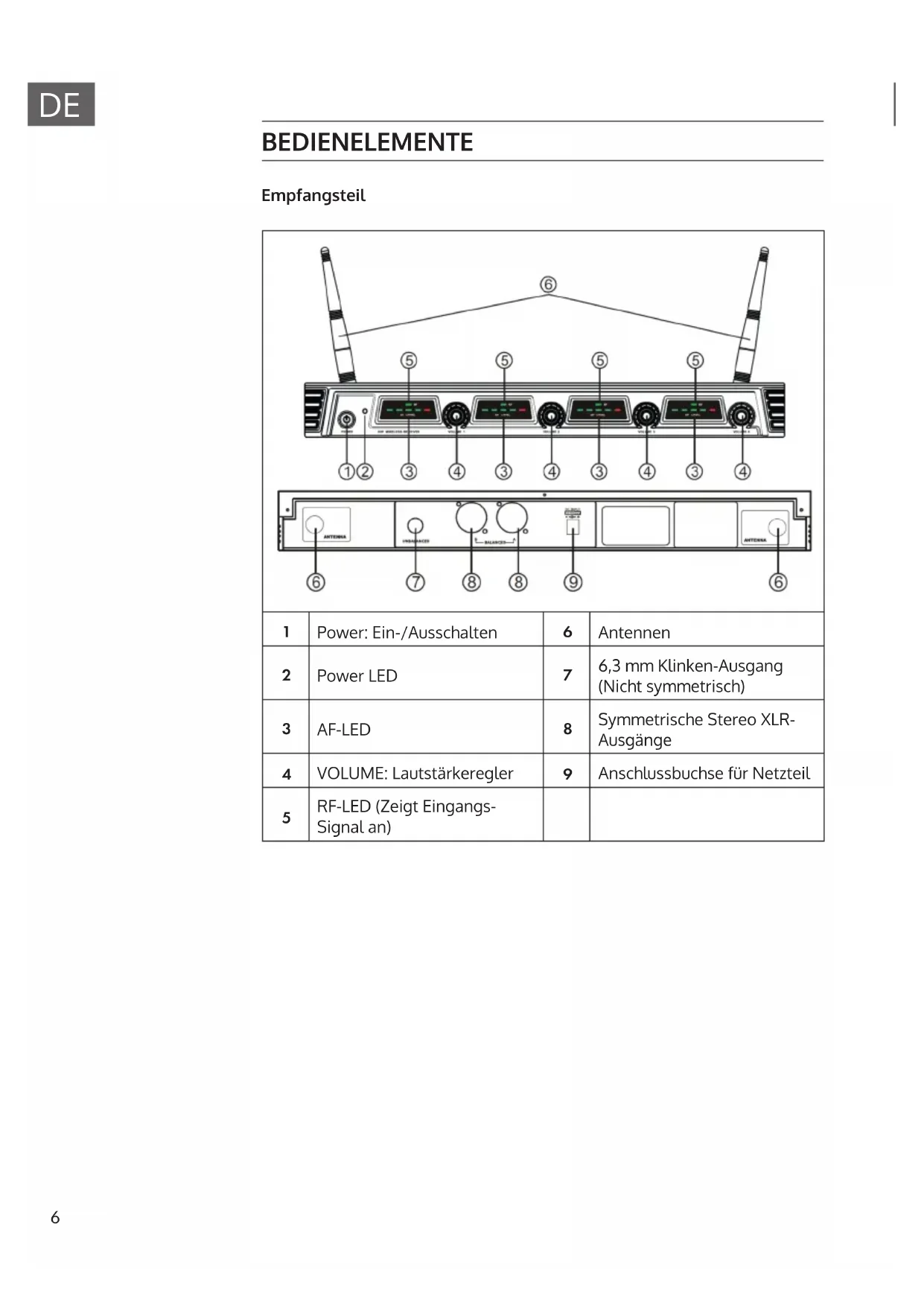 Verbinden Sie das Empfangsteil mit dem mitgelieferten Netzteil mit einer Steckdose. Verbinden Sie die Antennen mit den entsprechend gekennzeichneten Anschlüssen an der Rückseite. Stellen Sie die Antennen in einem etwa 45° betragenden Winkel ein, um bestmöglichen Empfang zu garantieren. Verbinden Sie, wie auf dem Diagramm angedeutet, die symmetrischen Ausgänge des Empfängers mit entsprechenden Eingängen Ihres Mischpultes, aktiven Lautsprechern, etc.10