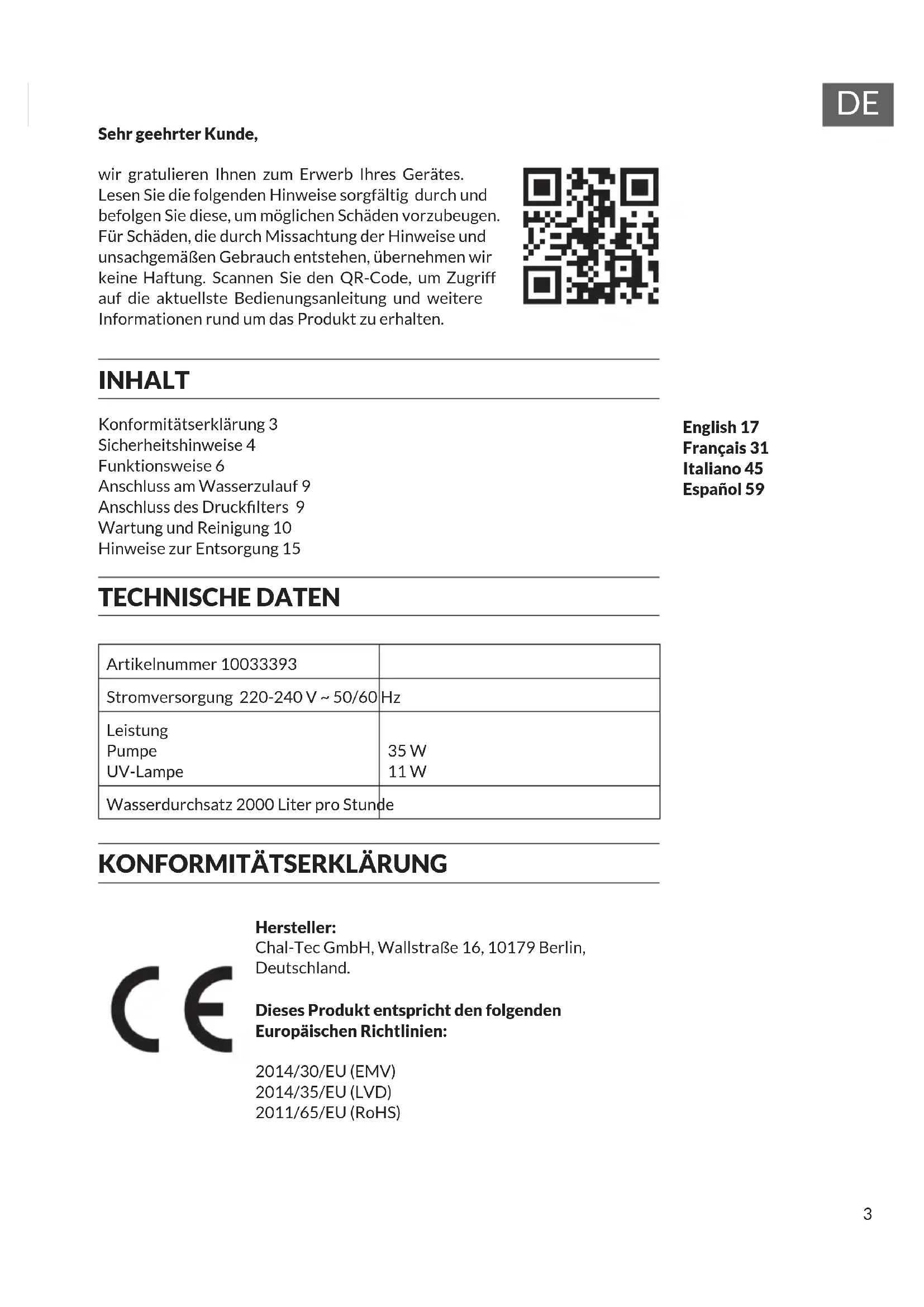 English 17 Français 31 Italiano 45 Español 59 Konformitätserklärung 3 Sicherheitshinweise 4 Funktionsweise 6 Anschluss am Wasserzulauf 9 Anschluss des Drucklters 9 Wartung und Reinigung 10 Hinweise zur Entsorgung 15 Sehr geehrter Kunde, wir gratulieren Ihnen zum Erwerb Ihres Gerätes. Lesen Sie die folgenden Hinweise sorgfältig durch und befolgen Sie diese, um möglichen Schäden vorzubeugen. Für Schäden, die durch Missachtung der Hinweise und unsachgemäßen Gebrauch entstehen, übernehmen wir keine Haftung. Scannen Sie den QR-Code, um Zugriff auf die aktuellste Bedienungsanleitung und weitere Informationen rund um das Produkt zu erhalten. TECHNISCHE DATEN Artikelnummer 10033393 Stromversorgung 220-240 V ~ 50/60 Hz Leistung Pumpe UV-Lampe 35 W 11 W Wasserdurchsatz 2000 Liter pro Stunde