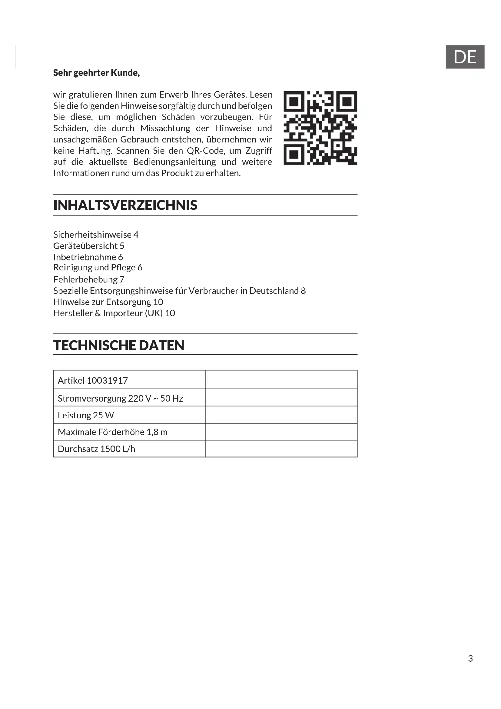 English Français Español Italiano Sehr geehrter Kunde, wir gratulieren Ihnen zum Erwerb Ihres Gerätes. Lesen Sie die folgenden Hinweise sorgfältig durch und befolgen Sie diese, um möglichen Schäden vorzubeugen. Für Schäden, die durch Missachtung der Hinweise und unsachgemäßen Gebrauch entstehen, übernehmen wir keine Haftung. Scannen Sie den QR-Code, um Zugriff auf die aktuellste Bedienungsanleitung und weitere Informationen rund um das Produkt zu erhalten. INHALTSVERZEICHNIS Sicherheitshinweise 4 Geräteübersicht 5 Inbetriebnahme 6 Reinigung und Pege 6 Fehlerbehebung 7 Spezielle Entsorgungshinweise für Verbraucher in Deutschland 8 Hinweise zur Entsorgung 10 Hersteller & Importeur (UK) 10 TECHNISCHE DATEN Artikel 10031917 Stromversorgung 220 V ~ 50 Hz Leistung 25 W Maximale Förderhöhe 1,8 m Durchsatz 1500 L/h4