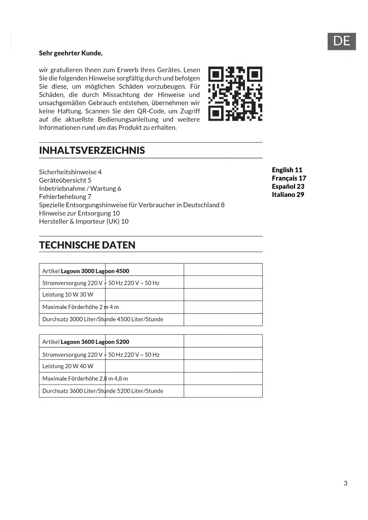 English 11 Français 17 Español 23 Italiano 29 Sehr geehrter Kunde, wir gratulieren Ihnen zum Erwerb Ihres Gerätes. Lesen Sie die folgenden Hinweise sorgfältig durch und befolgen Sie diese, um möglichen Schäden vorzubeugen. Für Schäden, die durch Missachtung der Hinweise und unsachgemäßen Gebrauch entstehen, übernehmen wir keine Haftung. Scannen Sie den QR-Code, um Zugriff auf die aktuellste Bedienungsanleitung und weitere Informationen rund um das Produkt zu erhalten. INHALTSVERZEICHNIS Sicherheitshinweise 4 Geräteübersicht 5 Inbetriebnahme / Wartung 6 Fehlerbehebung 7 Spezielle Entsorgungshinweise für Verbraucher in Deutschland 8 Hinweise zur Entsorgung 10 Hersteller & Importeur (UK) 10 TECHNISCHE DATEN Artikel Lagoon 3000 Lagoon 4500 Stromversorgung 220 V ~ 50 Hz 220 V ~ 50 Hz Leistung 10 W 30 W Maximale Förderhöhe 2 m 4 m Durchsatz 3000 Liter/Stunde 4500 Liter/Stunde Artikel Lagoon 3600 Lagoon 5200 Stromversorgung 220 V ~ 50 Hz 220 V ~ 50 Hz Leistung 20 W 40 W Maximale Förderhöhe 2,8 m 4,8 m Durchsatz 3600 Liter/Stunde 5200 Liter/Stunde4