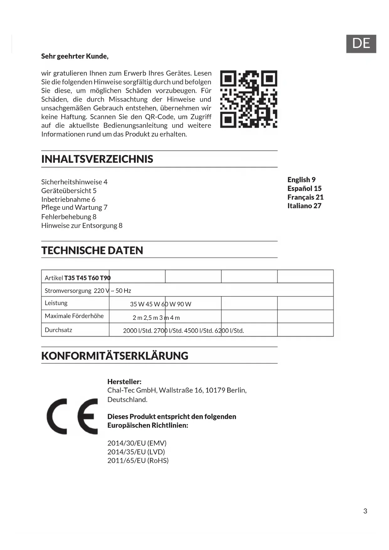 English 9 Español 15 Français 21 Italiano 27 Sehr geehrter Kunde, wir gratulieren Ihnen zum Erwerb Ihres Gerätes. Lesen Sie die folgenden Hinweise sorgfältig durch und befolgen Sie diese, um möglichen Schäden vorzubeugen. Für Schäden, die durch Missachtung der Hinweise und unsachgemäßen Gebrauch entstehen, übernehmen wir keine Haftung. Scannen Sie den QR-Code, um Zugriff auf die aktuellste Bedienungsanleitung und weitere Informationen rund um das Produkt zu erhalten. INHALTSVERZEICHNIS Sicherheitshinweise 4 Geräteübersicht 5 Inbetriebnahme 6 Pege und Wartung 7 Fehlerbehebung 8 Hinweise zur Entsorgung 8 TECHNISCHE DATEN Artikel T35 T45 T60 T90 Stromversorgung 220 V ~ 50 Hz Leistung 35 W 45 W 60 W 90 W Maximale Förderhöhe 2 m 2,5 m 3 m 4 m Durchsatz 2000 l/Std. 2700 l/Std. 4500 l/Std. 6200 l/Std.