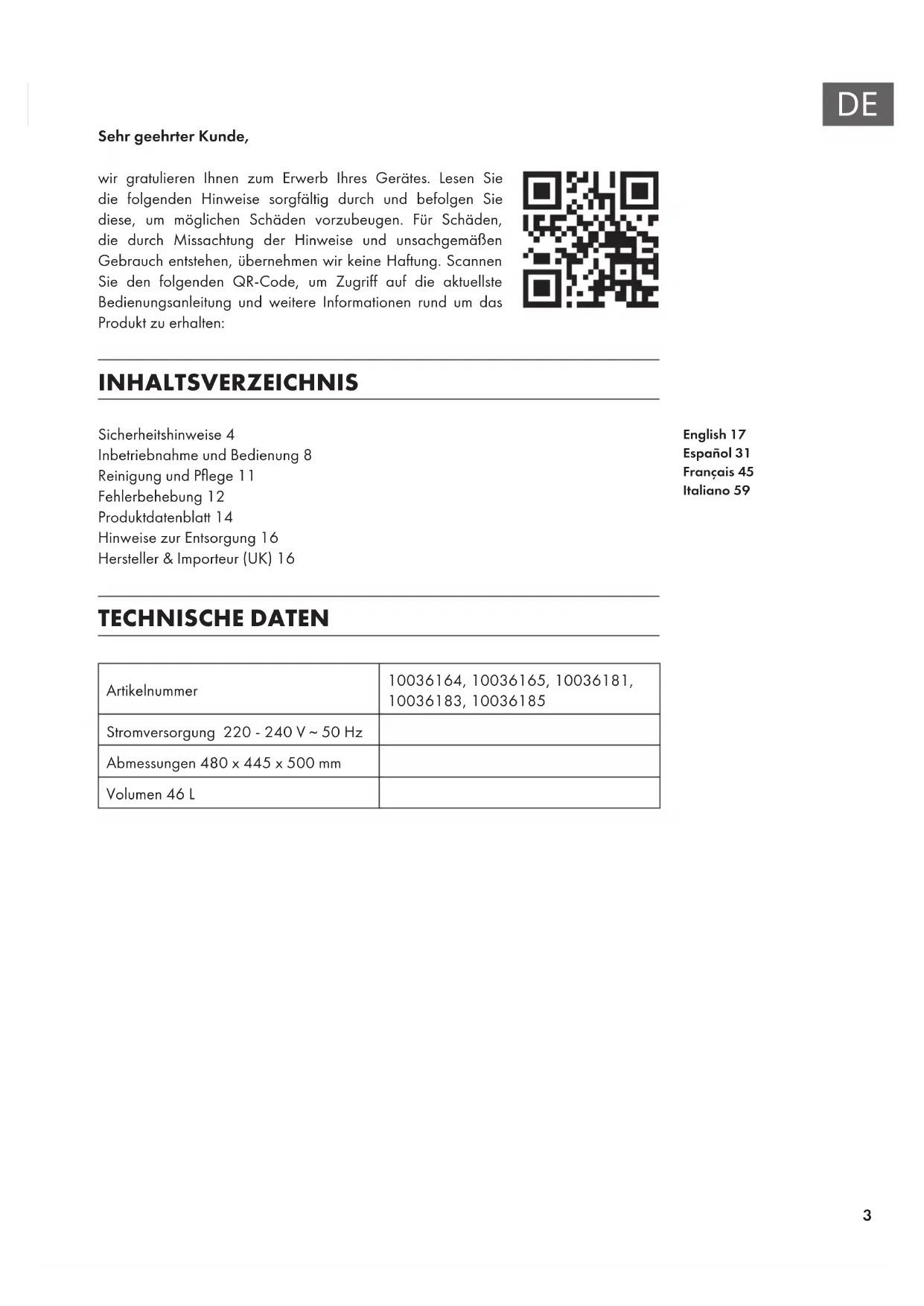 Sehr geehrter Kunde, wir gratulieren Ihnen zum Erwerb Ihres Gerätes. Lesen Sie die folgenden Hinweise sorgfältig durch und befolgen Sie diese, um möglichen Schäden vorzubeugen. Für Schäden, die durch Missachtung der Hinweise und unsachgemäßen Gebrauch entstehen, übernehmen wir keine Haftung. Scannen Sie den folgenden QR-Code, um Zugriff auf die aktuellste Bedienungsanleitung und weitere Informationen rund um das Produkt zu erhalten: INHALTSVERZEICHNIS Sicherheitshinweise4 Inbetriebnahme und Bedienung8 Reinigung und Pege11 Fehlerbehebung12 Produktdatenblatt14 Hinweise zur Entsorgung16 Hersteller & Importeur (UK)16 TECHNISCHE DATEN Artikelnummer 10036164, 10036165, 10036181, 10036183, 10036185 Stromversorgung 220 - 240 V ~ 50 Hz Abmessungen 480 x 445 x 500 mm Volumen 46 L English 17 Español 31 Français 45 Italiano 594