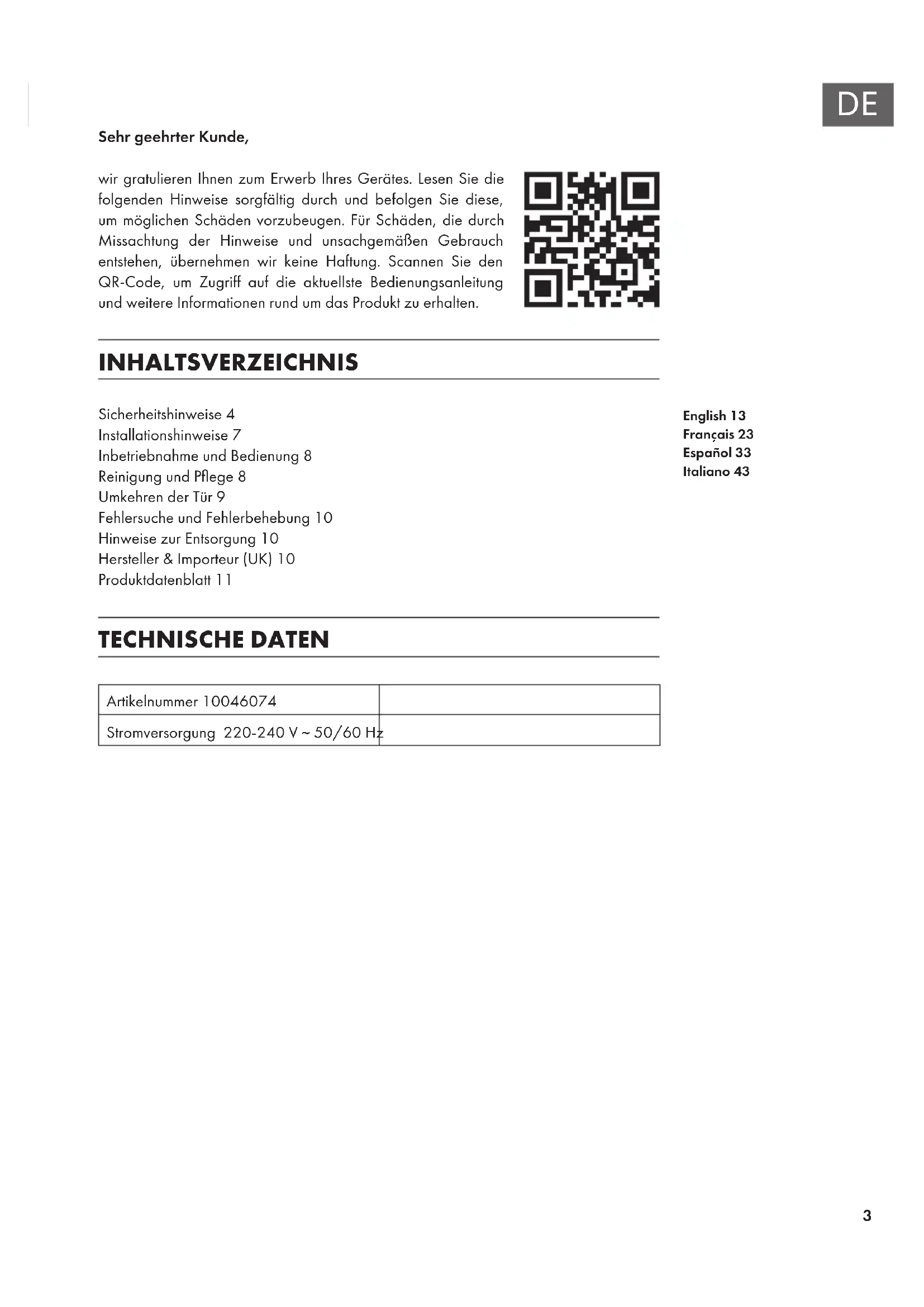 Sehr geehrter Kunde, wir gratulieren Ihnen zum Erwerb Ihres Gerätes. Lesen Sie die folgenden Hinweise sorgfältig durch und befolgen Sie diese, um möglichen Schäden vorzubeugen. Für Schäden, die durch Missachtung der Hinweise und unsachgemäßen Gebrauch entstehen, übernehmen wir keine Haftung. Scannen Sie den QR-Code, um Zugriff auf die aktuellste Bedienungsanleitung und weitere Informationen rund um das Produkt zu erhalten. INHALTSVERZEICHNIS Sicherheitshinweise4 Installationshinweise7 Inbetriebnahme und Bedienung8 Reinigung und Pege8 Umkehren der Tür9 Fehlersuche und Fehlerbehebung10 Hinweise zur Entsorgung10 Hersteller & Importeur (UK)10 Produktdatenblatt11 TECHNISCHE DATEN Artikelnummer 10046074 Stromversorgung 220-240 V ~ 50/60 Hz English 13 Français 23 Español 33 Italiano 434