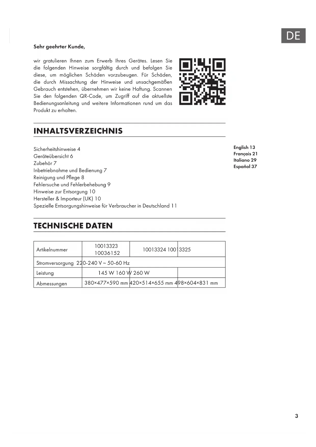 Sehr geehrter Kunde, wir gratulieren Ihnen zum Erwerb Ihres Gerätes. Lesen Sie die folgenden Hinweise sorgfältig durch und befolgen Sie diese, um möglichen Schäden vorzubeugen. Für Schäden, die durch Missachtung der Hinweise und unsachgemäßen Gebrauch entstehen, übernehmen wir keine Haftung. Scannen Sie den folgenden QR-Code, um Zugriff auf die aktuellste Bedienungsanleitung und weitere Informationen rund um das Produkt zu erhalten. INHALTSVERZEICHNIS Sicherheitshinweise4 Geräteübersicht6 Zubehör7 Inbetriebnahme und Bedienung7 Reinigung und Pege8 Fehlersuche und Fehlerbehebung9 Hinweise zur Entsorgung10 Hersteller & Importeur (UK)10 Spezielle Entsorgungshinweise für Verbraucher in Deutschland11 TECHNISCHE DATEN Artikelnummer