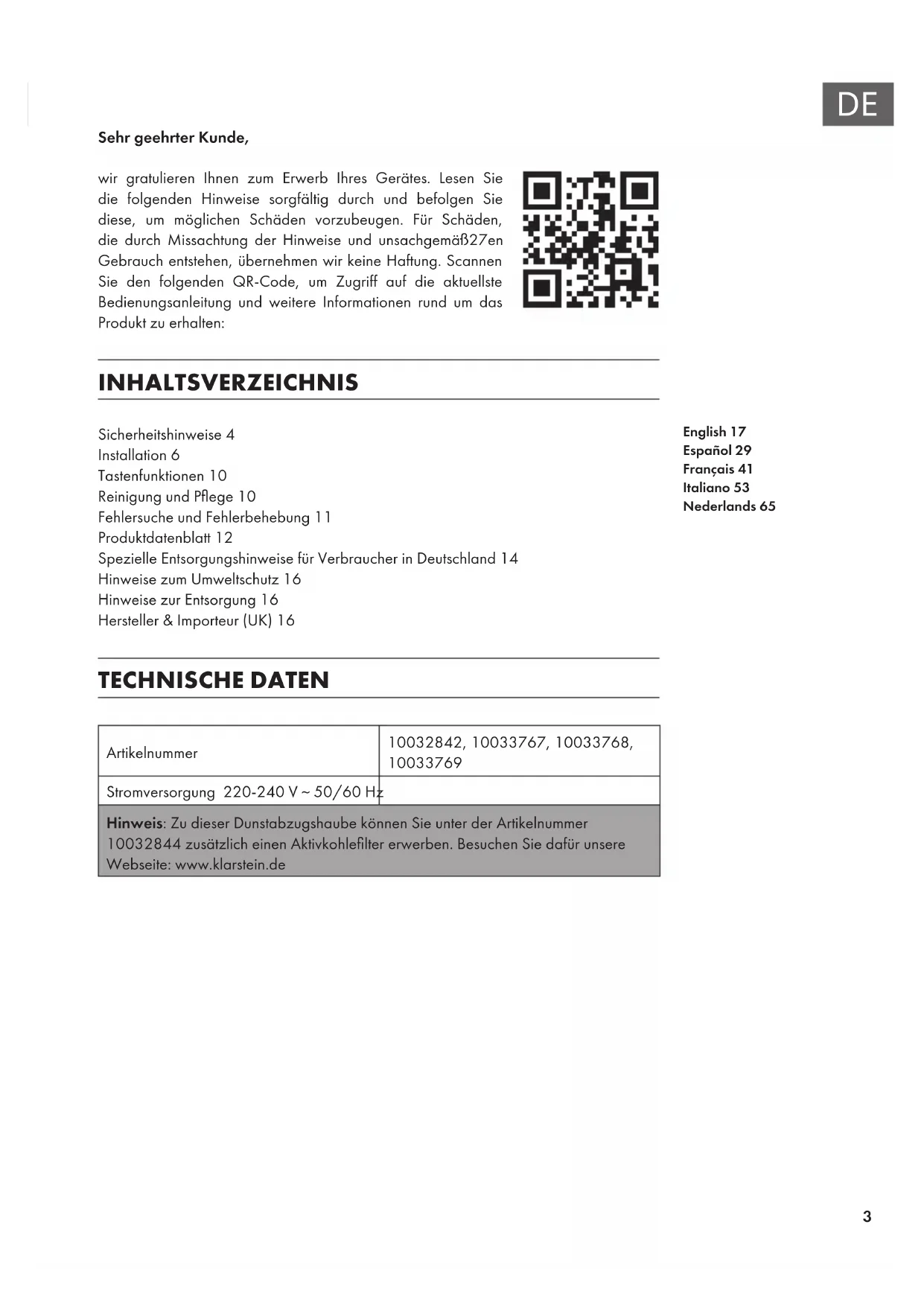 Sehr geehrter Kunde, wir gratulieren Ihnen zum Erwerb Ihres Gerätes. Lesen Sie die folgenden Hinweise sorgfältig durch und befolgen Sie diese, um möglichen Schäden vorzubeugen. Für Schäden, die durch Missachtung der Hinweise und unsachgemäß27en Gebrauch entstehen, übernehmen wir keine Haftung. Scannen Sie den folgenden QR-Code, um Zugriff auf die aktuellste Bedienungsanleitung und weitere Informationen rund um das Produkt zu erhalten: INHALTSVERZEICHNIS Sicherheitshinweise4 Installation6 Tastenfunktionen10 Reinigung und Pege10 Fehlersuche und Fehlerbehebung11 Produktdatenblatt12 Spezielle Entsorgungshinweise für Verbraucher in Deutschland14 Hinweise zum Umweltschutz16 Hinweise zur Entsorgung16 Hersteller & Importeur (UK)16 TECHNISCHE DATEN Artikelnummer 10032842, 10033767, 10033768,