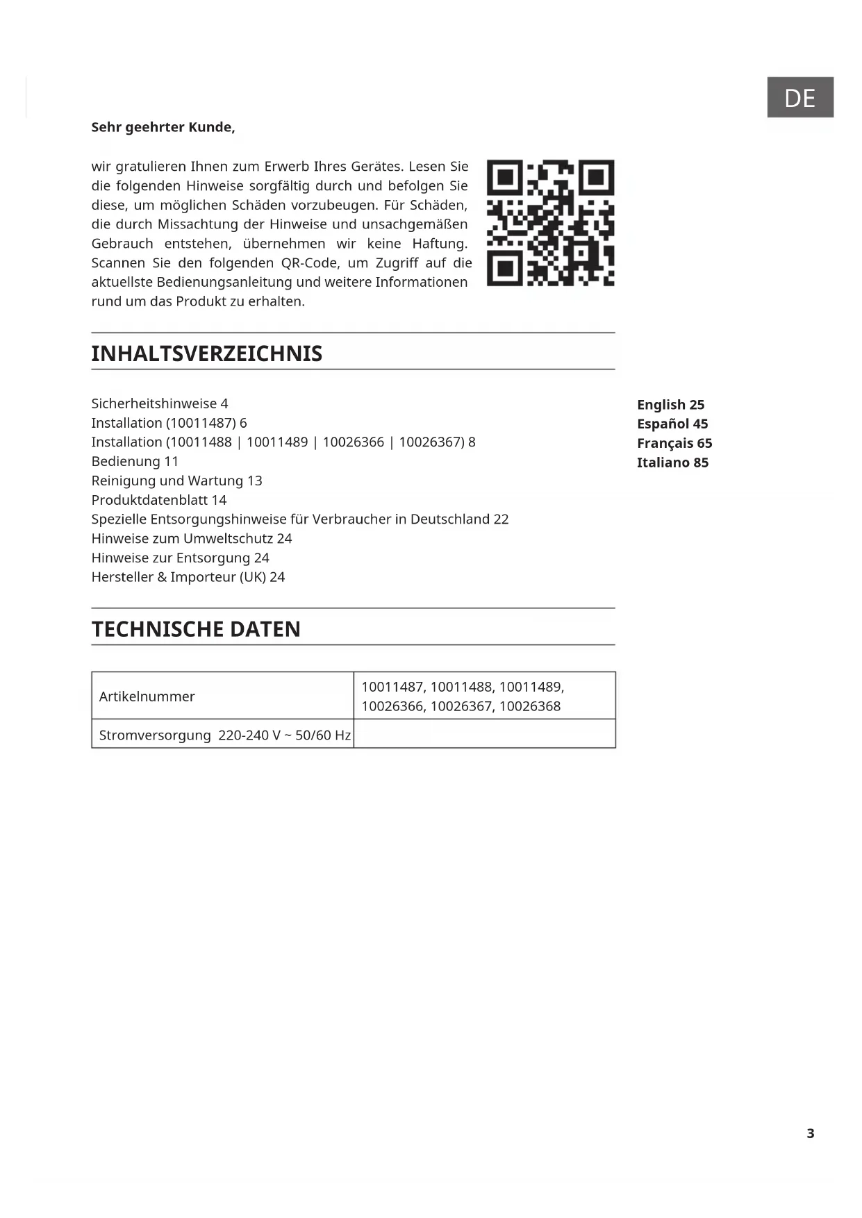 Sehr geehrter Kunde, wir gratulieren Ihnen zum Erwerb Ihres Gerätes. Lesen Sie die folgenden Hinweise sorgfältig durch und befolgen Sie diese, um möglichen Schäden vorzubeugen. Für Schäden, die durch Missachtung der Hinweise und unsachgemäßen Gebrauch entstehen, übernehmen wir keine Haftung. Scannen Sie den folgenden QR-Code, um Zugri auf die aktuellste Bedienungsanleitung und weitere Informationen rund um das Produkt zu erhalten. INHALTSVERZEICHNIS Sicherheitshinweise 4 Installation (10011487) 6 Installation (10011488 | 10011489 | 10026366 | 10026367) 8 Bedienung 11 Reinigung und Wartung 13 Produktdatenblatt 14 Spezielle Entsorgungshinweise für Verbraucher in Deutschland 22 Hinweise zum Umweltschutz 24 Hinweise zur Entsorgung 24 Hersteller & Importeur (UK) 24 TECHNISCHE DATEN Artikelnummer 10011487, 10011488, 10011489, 10026366, 10026367, 10026368 Stromversorgung 220-240 V ~ 50/60 Hz English 25 Español 45 Français 65 Italiano 854