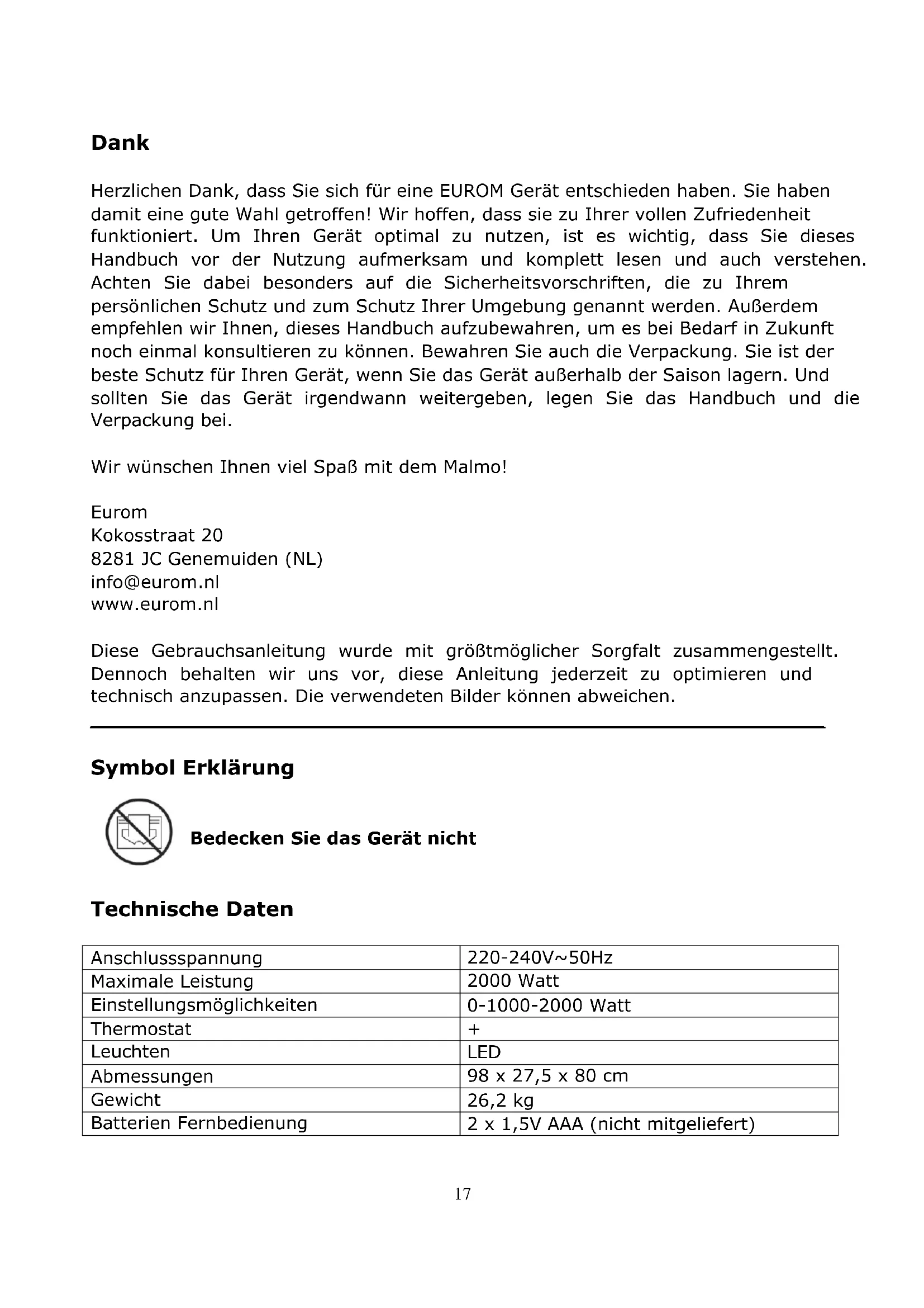 BEDIENUNGSANLEITUNG Malmo Eurom