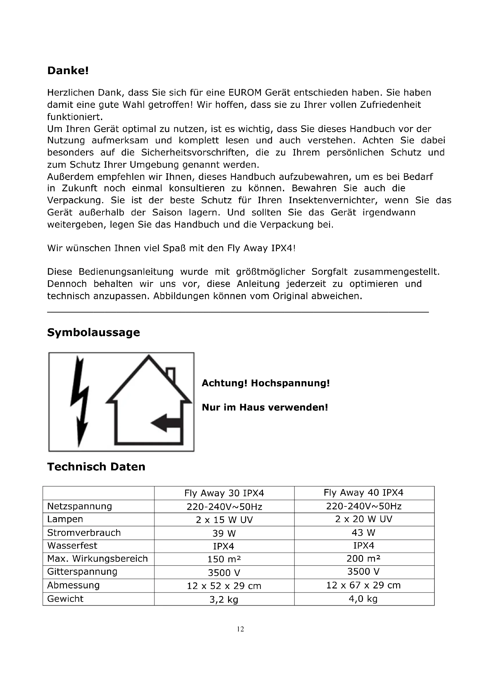 Achtung! Hochspannung! Nur im Haus verwenden!