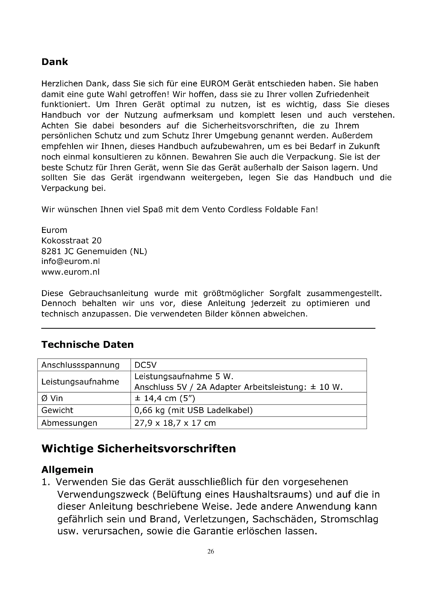 Dank Herzlichen Dank, dass Sie sich für eine EUROM Gerät entschieden haben. Sie haben damit eine gute Wahl getroffen! Wir hoffen, dass sie zu Ihrer vollen Zufriedenheit funktioniert. Um Ihren Gerät optimal zu nutzen, ist es wichtig, dass Sie dieses Handbuch vor der Nutzung aufmerksam und komplett lesen und auch verstehen. Achten Sie dabei besonders auf die Sicherheitsvorschriften, die zu Ihrem persönlichen Schutz und zum Schutz Ihrer Umgebung genannt werden. Außerdem empfehlen wir Ihnen, dieses Handbuch aufzubewahren, um es bei Bedarf in Zukunft noch einmal konsultieren zu können. Bewahren Sie auch die Verpackung. Sie ist der beste Schutz für Ihren Gerät, wenn Sie das Gerät außerhalb der Saison lagern. Und sollten Sie das Gerät irgendwann weitergeben, legen Sie das Handbuch und die Verpackung bei. Wir wünschen Ihnen viel Spaß mit dem Vento Cordless Foldable Fan! Eurom Kokosstraat 20 8281 JC Genemuiden (NL) info@eurom.nl www.eurom.nl Diese Gebrauchsanleitung wurde mit größtmöglicher Sorgfalt zusammengestellt. Dennoch behalten wir uns vor, diese Anleitung jederzeit zu optimieren und technisch anzupassen. Die verwendeten Bilder können abweichen.