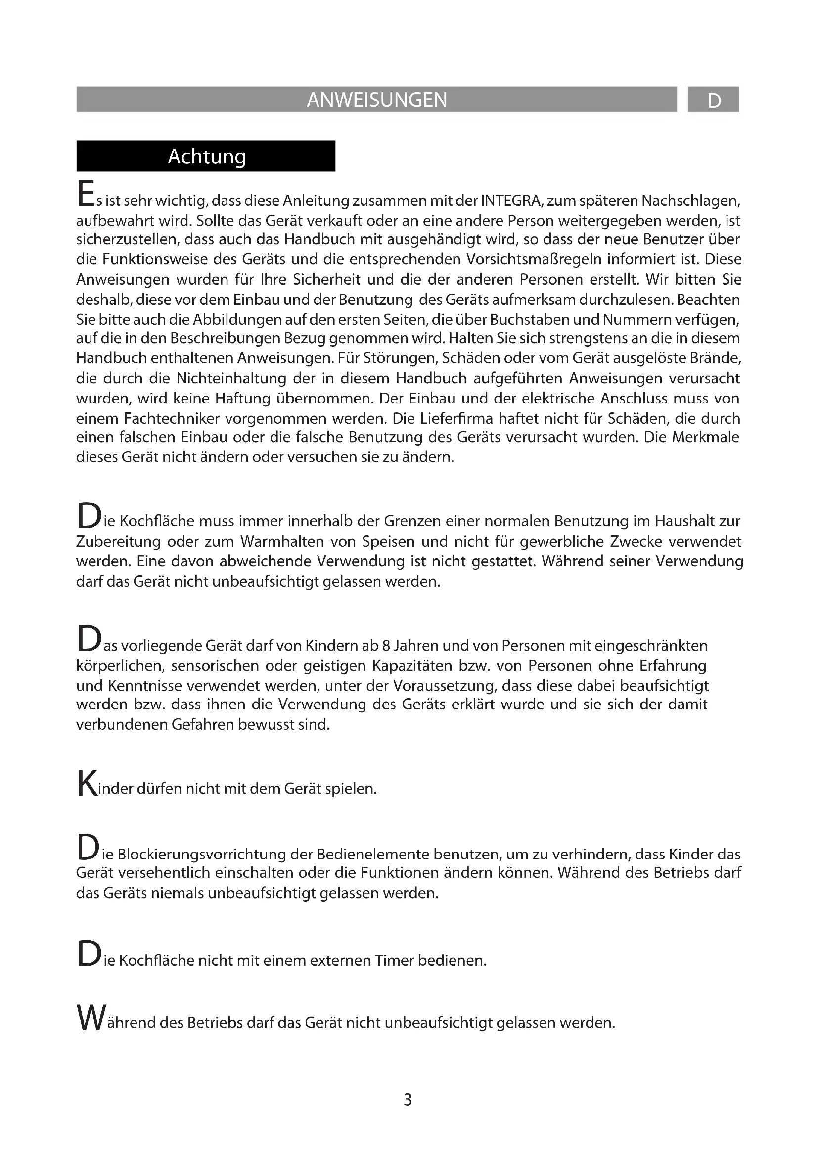 s ist sehr wichtig, dass diese Anleitung zusammen mit der INTEGRA, zum späteren Nachschlagen, aufbewahrt wird. Sollte das Gerät verkauft oder an eine andere Person weitergegeben werden, ist sicherzustellen, dass auch das Handbuch mit ausgehändigt wird, so dass der neue Benutzer über die Funktionsweise des Geräts und die entsprechenden Vorsichtsmaßregeln informiert ist. Diese Anweisungen wurden für Ihre Sicherheit und die der anderen Personen erstellt. Wir bitten Sie deshalb, diese vor dem Einbau und der Benutzung des Geräts aufmerksam durchzulesen. Beachten Sie bitte auch die Abbildungen auf den ersten Seiten, die über Buchstaben und Nummern verfügen, auf die in den Beschreibungen Bezug genommen wird. Halten Sie sich strengstens an die in diesem Handbuch enthaltenen Anweisungen. Für Störungen, Schäden oder vom Gerät ausgelöste Brände, die durch die Nichteinhaltung der in diesem Handbuch aufgeführten Anweisungen verursacht wurden, wird keine Haftung übernommen. Der Einbau und der elektrische Anschluss muss von einem Fachtechniker vorgenommen werden. Die Lieferrma haftet nicht für Schäden, die durch einen falschen Einbau oder die falsche Benutzung des Geräts verursacht wurden. Die Merkmale dieses Gerät nicht ändern oder versuchen sie zu ändern.