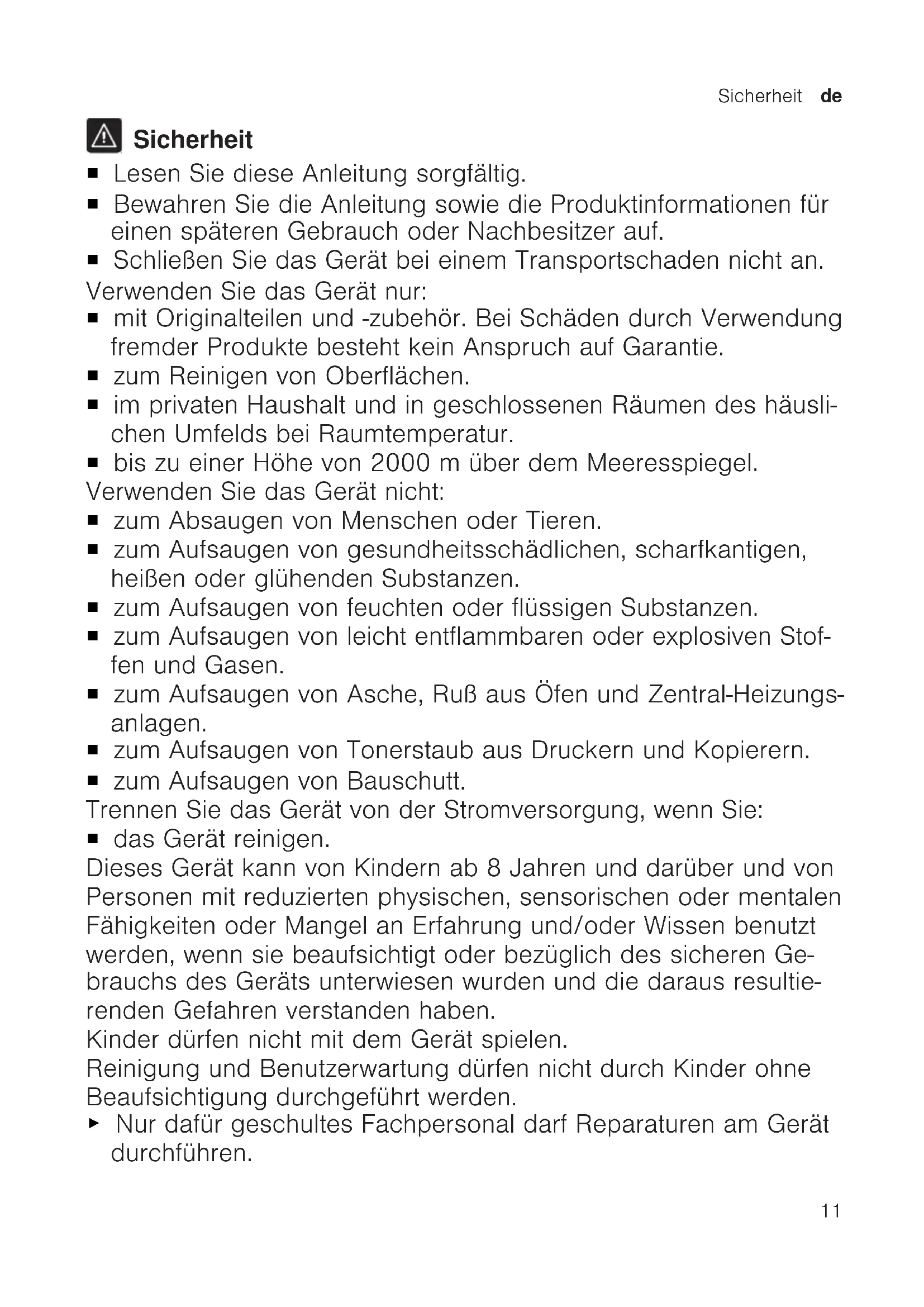 Sicherheit ¡ Lesen Sie diese Anleitung sorgfältig. ¡ Bewahren Sie die Anleitung sowie die Produktinformationen für einen späteren Gebrauch oder Nachbesitzer auf. ¡ Schließen Sie das Gerät bei einem Transportschaden nicht an. Verwenden Sie das Gerät nur: ¡ mit Originalteilen und -zubehör. Bei Schäden durch Verwendung fremder Produkte besteht kein Anspruch auf Garantie. ¡ zum Reinigen von Oberflächen. ¡ im privaten Haushalt und in geschlossenen Räumen des häusli- chen Umfelds bei Raumtemperatur. ¡ bis zu einer Höhe von 2000m über dem Meeresspiegel. Verwenden Sie das Gerät nicht: ¡ zum Absaugen von Menschen oder Tieren. ¡ zum Aufsaugen von gesundheitsschädlichen, scharfkantigen, heißen oder glühenden Substanzen. ¡ zum Aufsaugen von feuchten oder flüssigen Substanzen. ¡ zum Aufsaugen von leicht entflammbaren oder explosiven Stof- fen und Gasen. ¡ zum Aufsaugen von Asche, Ruß aus Öfen und Zentral-Heizungs- anlagen. ¡ zum Aufsaugen von Tonerstaub aus Druckern und Kopierern. ¡ zum Aufsaugen von Bauschutt. Trennen Sie das Gerät von der Stromversorgung, wenn Sie: ¡ das Gerät reinigen. Dieses Gerät kann von Kindern ab 8 Jahren und darüber und von Personen mit reduzierten physischen, sensorischen oder mentalen Fähigkeiten oder Mangel an Erfahrung und/oder Wissen benutzt werden, wenn sie beaufsichtigt oder bezüglich des sicheren Ge- brauchs des Geräts unterwiesen wurden und die daraus resultie- renden Gefahren verstanden haben. Kinder dürfen nicht mit dem Gerät spielen. Reinigung und Benutzerwartung dürfen nicht durch Kinder ohne Beaufsichtigung durchgeführt werden. ▶ Nur dafür geschultes Fachpersonal darf Reparaturen am Gerät durchführen.de Sicherheit