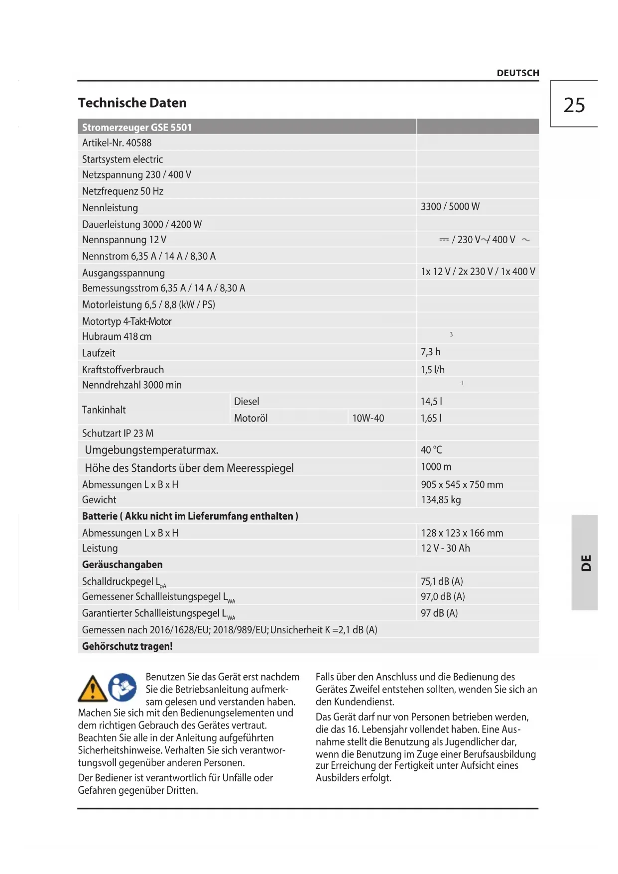Tankinhalt Diesel 14,5 l Motoröl 10W-40 1,65 l Schutzart IP 23 M Umgebungstemperaturmax. 40 °C Höhe des Standorts über dem Meeresspiegel 1000 m Abmessungen L x B x H 905 x 545 x 750 mm Gewicht 134,85 kg Batterie ( Akku nicht im Lieferumfang enthalten ) Abmessungen L x B x H 128 x 123 x 166 mm Leistung 12 V - 30 Ah Geräuschangaben Schalldruckpegel L