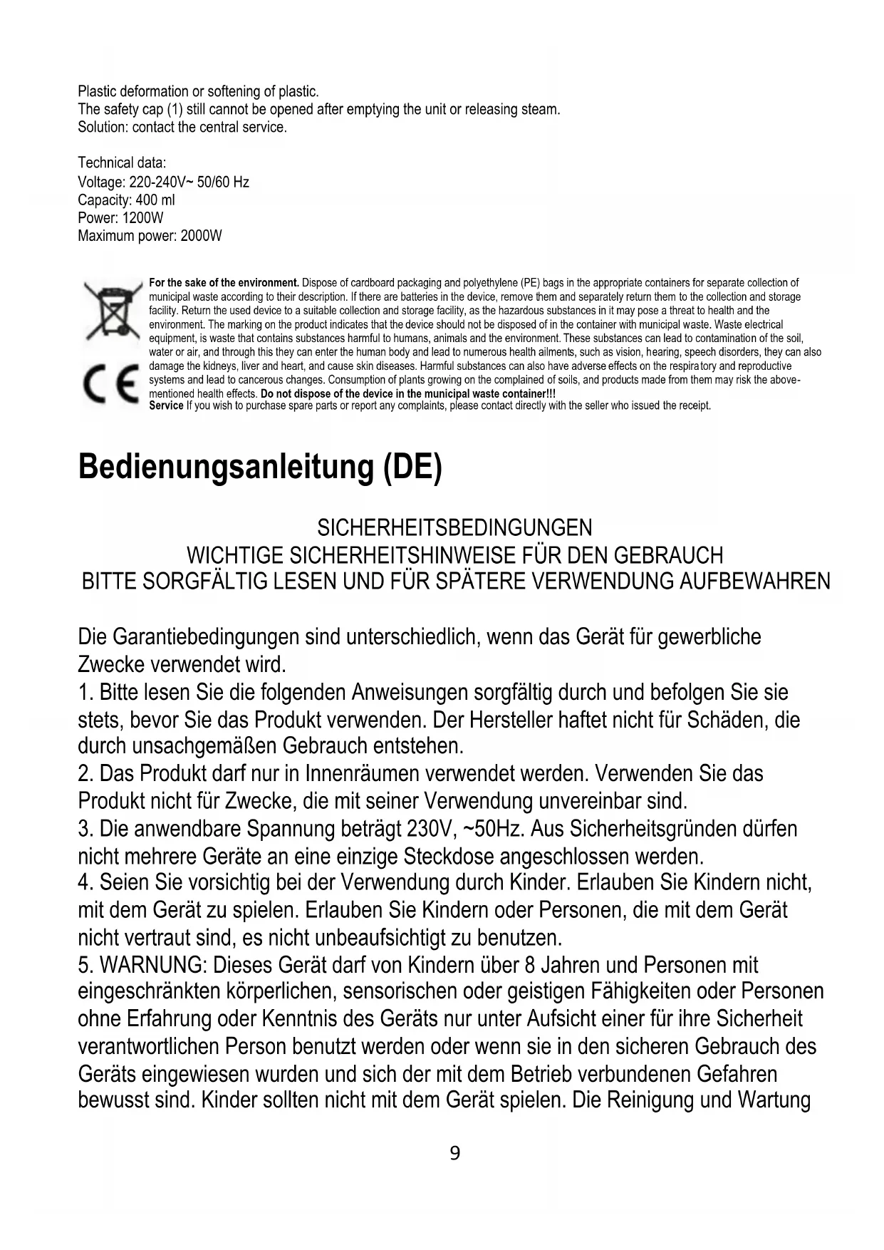 Lagerung: Alle Teile müssen vor der Lagerung vollständig trocken sein. - Lagern Sie den Dampfreiniger immer an einem trockenen, sauberen und staubfreien Ort. - Bewahren Sie den Dampfreiniger unter Verschluss auf, stellen Sie ihn so auf, dass das Gerät für Kinder unzugänglich ist. Fehlersuche Problem: Es kommt kein Dampf aus der Düse Ursache: Der Stecker ist nicht in der Steckdose eingesteckt Lösung: Schließen Sie das Gerät an eine Steckdose an Ursache: Es ist kein Wasser im Tank. Lösung: Gießen Sie Wasser in den Tank. Ursache: Die Dampftaste ist nicht gedrückt. Lösung: Lösen Sie die Kindersicherung und drücken Sie die Dampftaste. Problem: Nur das grüne Licht ist an. Das rote Licht leuchtet nicht. Ursache: Die Lampe ist durchgebrannt. Lösung: Wenden Sie sich an den zentralen Kundendienst. Problem: Rotes Licht immer an, grünes Licht leuchtet nicht. Ursache: Defekte elektrische Innenteile oder defekter Thermostat. Lösung: Wenden Sie sich an die zentrale Kundendienststelle. Problem: Flackerndes rotes Licht. Ursache: Wassermangel oder schlechte Netzverbindung. Lösung: Prüfen Sie, ob das Gerät richtig angeschlossen und vollständig mit dem Stromnetz verbunden ist. Füllen Sie Wasser nach. Wenn das Flackern weiterhin auftritt, wenden Sie sich an den zentralen Kundendienst. Problem: Wasser tritt aus der Düse aus. Ursache: Lange Zeit nicht benutzt und Dampf in Düse/Zubehör kondensiert. Lösung: Normales Phänomen. Drücken Sie die Dampffreigabetaste für 2 Sekunden. Wenn das Gerät immer noch Wasser aus der Düse spuckt, ist zu viel Wasser im Gerät. Wenn nach längerem Gebrauch kohlensäurefreies Wasser aus der Düse kommt, wenden Sie sich an den zentralen Kundendienst. Andere Probleme: Dampf, der aus dem Gerät an anderen Stellen als der Dampfdüse austritt. Kunststoffverformung oder Erweichung des Kunststoffs. Nach dem Entleeren des Geräts oder dem Ablassen von Dampf lässt sich die Sicherheitskappe (1) immer noch nicht öffnen. Lösung: Wenden Sie sich an den zentralen Kundendienst. Technische Daten: Spannung: 220-240V~ 50/60 Hz Fassungsvermögen: 400 ml Leistung: 1200W Maximale Leistung: 2000W14