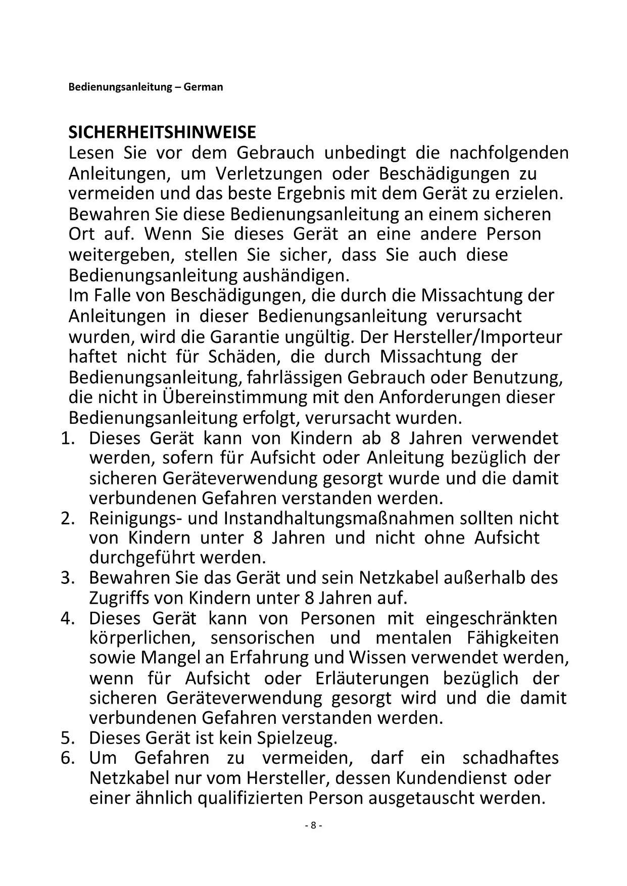 Recycling – European Directive 2012/19/EU This marking indicates that this product should not be disposed with other household wastes. To prevent possible harm to the environment or human health from uncontrolled waste disposal, recycle it responsibly to promote the sustainable reuse of material resources. To return your used device, please use the return and collection systems or contact the retailer where the product was purchased. They can take this product for environmental safe recycling. Emerio Holland B.V. Zomervaart 1A 2033 DA Haarlem The Netherlands Customer service: T: +31(0)23 3034369 E: info.nl@emerio.eu- 8 - Bedienungsanleitung – German SICHERHEITSHINWEISE Lesen Sie vor dem Gebrauch unbedingt die nachfolgenden Anleitungen, um Verletzungen oder Beschädigungen zu vermeiden und das beste Ergebnis mit dem Gerät zu erzielen. Bewahren Sie diese Bedienungsanleitung an einem sicheren Ort auf. Wenn Sie dieses Gerät an eine andere Person weitergeben, stellen Sie sicher, dass Sie auch diese Bedienungsanleitung aushändigen. Im Falle von Beschädigungen, die durch die Missachtung der Anleitungen in dieser Bedienungsanleitung verursacht wurden, wird die Garantie ungültig. Der Hersteller/Importeur haftet nicht für Schäden, die durch Missachtung der Bedienungsanleitung, fahrlässigen Gebrauch oder Benutzung, die nicht in Übereinstimmung mit den Anforderungen dieser Bedienungsanleitung erfolgt, verursacht wurden.