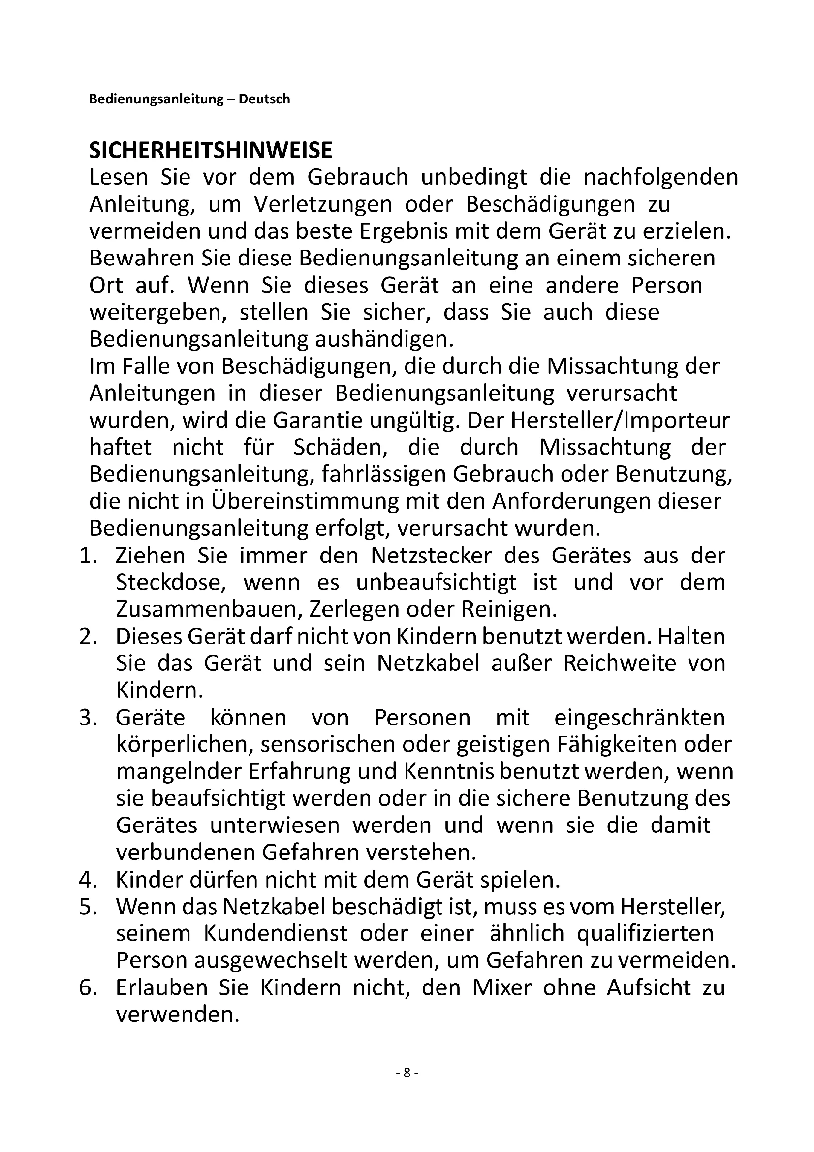Recycling – European Directive 2012/19/EU This marking indicates that this product should not be disposed with other household wastes. To prevent possible harm to the environment or human health from uncontrolled waste disposal, recycle it responsibly to promote the sustainable reuse of material resources. To return your used device, please use the return and collection systems or contact the retailer where the product was purchased. They can take this product for environmental safe recycling. LIPO Einrichtungsmärkte AG, Rüti Center, Rütiweg 7, CH-4133 Pratteln- 8 - Bedienungsanleitung – Deutsch SICHERHEITSHINWEISE Lesen Sie vor dem Gebrauch unbedingt die nachfolgenden Anleitung, um Verletzungen oder Beschädigungen zu vermeiden und das beste Ergebnis mit dem Gerät zu erzielen. Bewahren Sie diese Bedienungsanleitung an einem sicheren Ort auf. Wenn Sie dieses Gerät an eine andere Person weitergeben, stellen Sie sicher, dass Sie auch diese Bedienungsanleitung aushändigen. Im Falle von Beschädigungen, die durch die Missachtung der Anleitungen in dieser Bedienungsanleitung verursacht wurden, wird die Garantie ungültig. Der Hersteller/Importeur haftet nicht für Schäden, die durch Missachtung der Bedienungsanleitung, fahrlässigen Gebrauch oder Benutzung, die nicht in Übereinstimmung mit den Anforderungen dieser Bedienungsanleitung erfolgt, verursacht wurden.