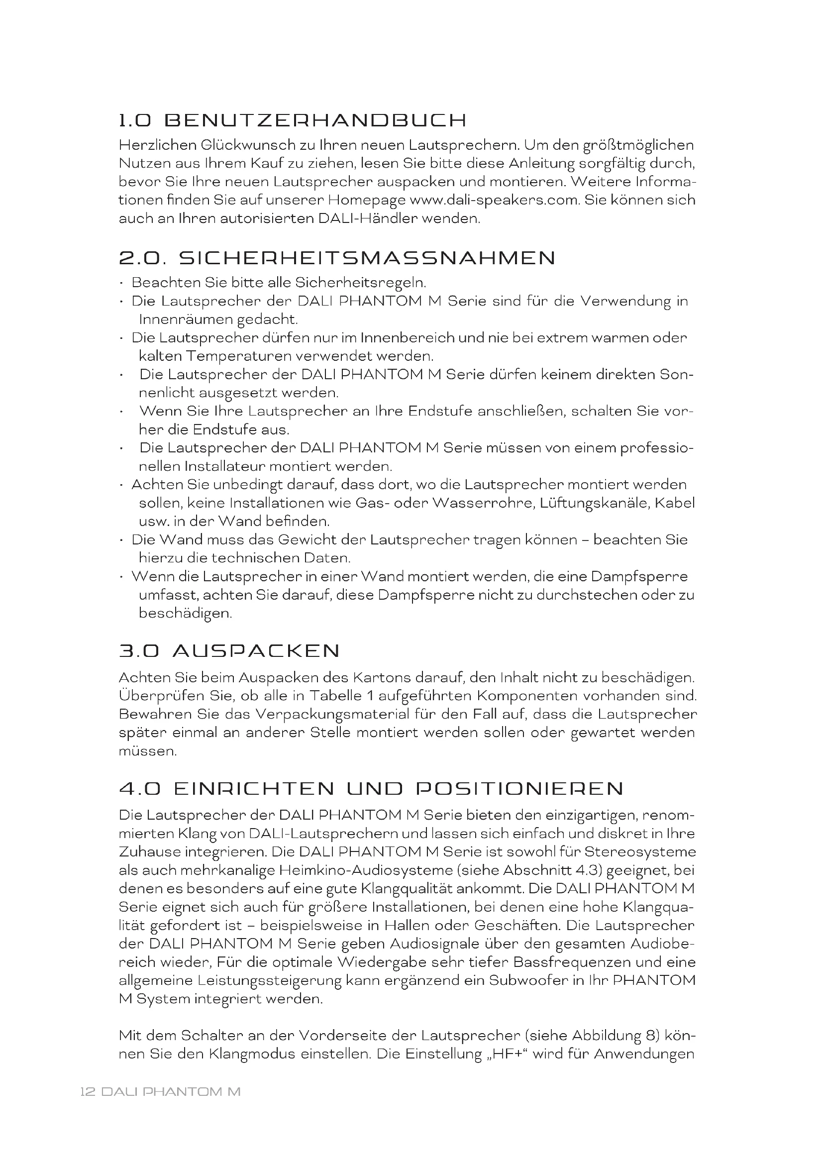 - Die Lautsprecher der DALI PHANTOM M Serie sind für die Verwendung in Innenräumen gedacht.
