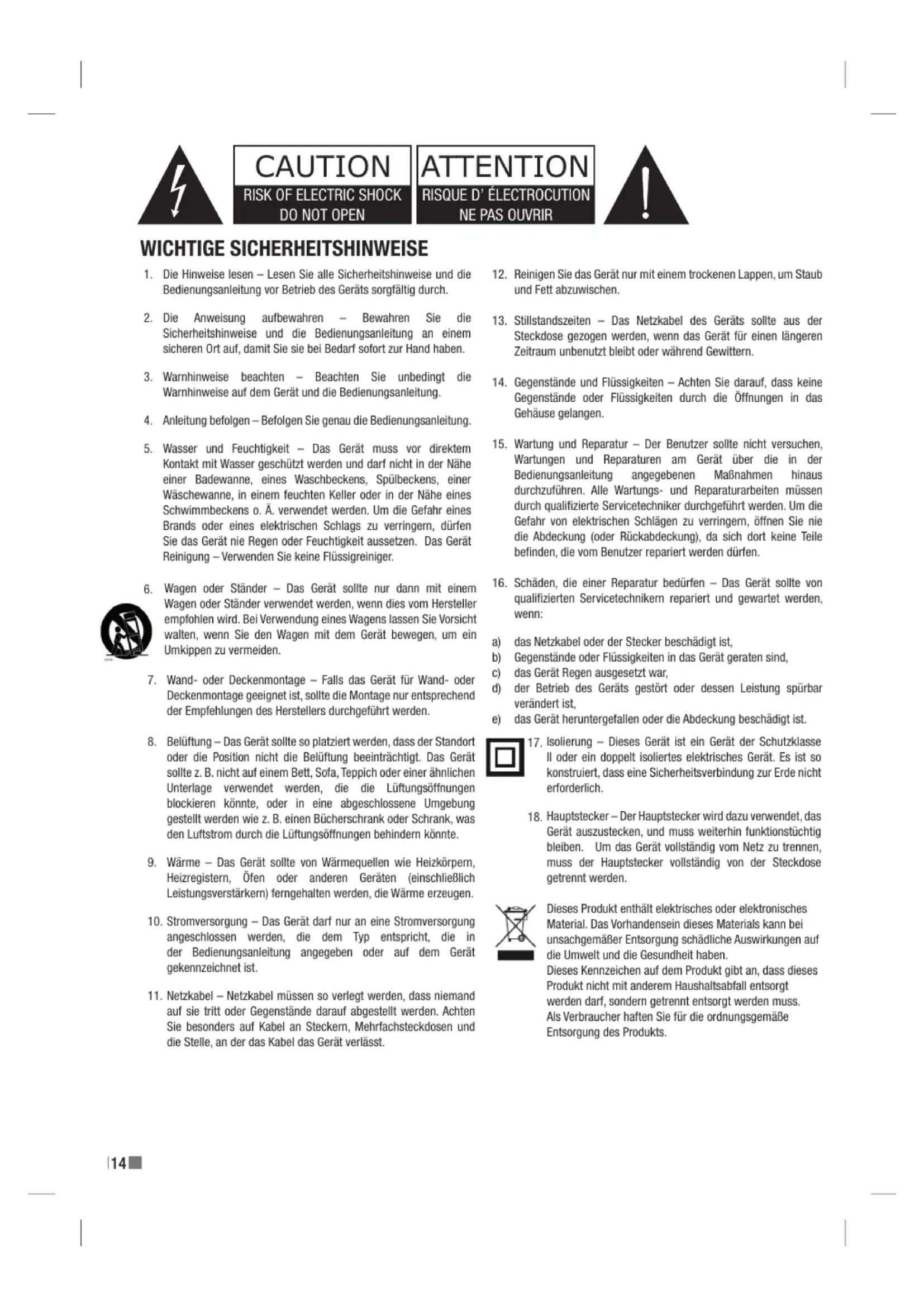Isolierung – Dieses Gerät ist ein Gerät der Schutzklasse II oder ein doppelt isoliertes elektrisches Gerät. Es ist so konstruiert, dass eine Sicherheitsverbindung zur Erde nicht erforderlich. Hauptstecker – Der Hauptstecker wird dazu verwendet, das Gerät auszustecken, und muss weiterhin funktionstüchtig bleiben. Um das Gerät vollständig vom Netz zu trennen, muss der Hauptstecker vollständig von der Steckdose getrennt werden. Dieses Produkt enthält elektrisches oder elektronisches Material. Das Vorhandensein dieses Materials kann bei unsachgemäßer Entsorgung schädliche Auswirkungen auf die Umwelt und die Gesundheit haben. Dieses Kennzeichen auf dem Produkt gibt an, dass dieses Produkt nicht mit anderem Haushaltsabfall entsorgt werden darf, sondern getrennt entsorgt werden muss. Als Verbraucher haften Sie für die ordnungsgemäße Entsorgung des Produkts.