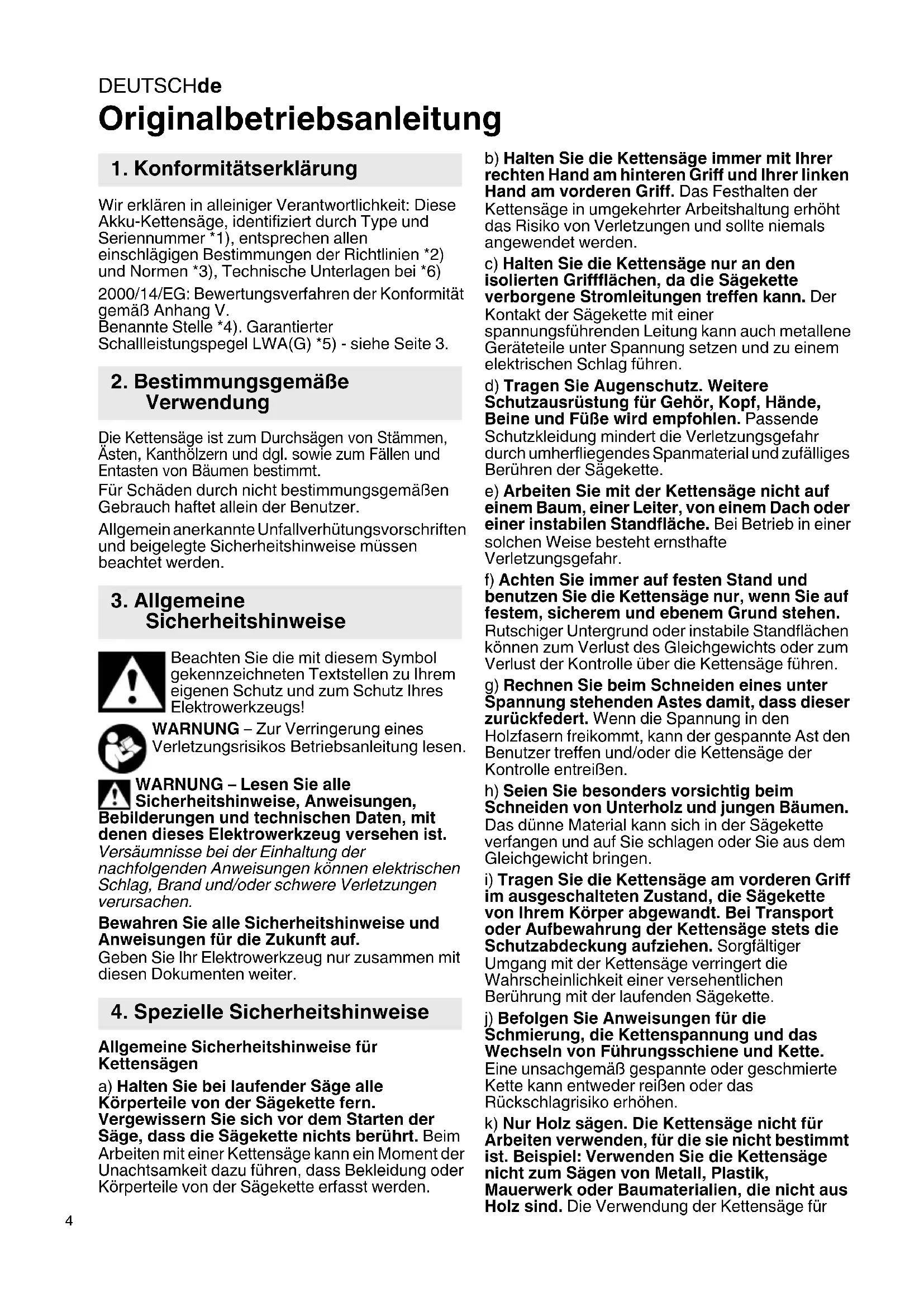 nicht bestimmungsgemäße Arbeiten kann zu gefährlichen Situationen führen. l) Versuchen Sie nicht einen Baum zu fällen, bevor Sie nicht ein klares Verständnis der Risiken und ihrer Vermeidung haben. Der Benutzer oder andere Personen können durch einen umstürzenden Baum schwer verletzt werden. m) Befolgen Sie alle Anweisungen, wenn Sie die Kettensäge von Materialansammlungen befreien, lagern oder Wartungsarbeiten durchführen. Vergewissern Sie sich, dass der Schalter ausgeschaltet und der Akku entfernt ist. Ein unerwarteter Betrieb der Kettensäge beim Entfernen von Materialansammlungen oder während Wartungsarbeiten kann zu ernsthaften Verletzungen führen. Ursachen und Vermeidung eines Rückschlags Rückschlag kann auftreten, wenn die Spitze der Führungsschiene einen Gegenstand berührt oder wenn das Holz sich biegt und die Sägekette im Schnitt festklemmt. Eine Berührung mit der Schienenspitze kann in manchen Fällen zu einer unerwarteten nach hinten gerichteten Reaktion führen, bei der die Führungsschiene nach oben und in Richtung des Benutzers geschlagen wird. Das Verklemmen der Sägekette an der Oberkante der Führungsschiene kann die Schiene rasch in Benutzerrichtung zurückstoßen. Jede dieser Reaktionen kann dazu führen, dass Sie die Kontrolle über die Säge verlieren und sich möglicherweise schwer verletzen. Verlassen Sie sich nicht ausschließlich auf die in der Kettensäge eingebauten Sicherheitseinrichtungen. Als Benutzer einer Kettensäge sollten Sie verschiedene Maßnahmen ergreifen, um unfall- und verletzungsfrei zu arbeiten. Ein Rückschlag ist die Folge eines falschen oder fehlerhaften Gebrauchs der Kettensäge. Er kann durch geeignete Vorsichtsmaßnahmen, wie nachfolgend beschrieben, verhindert werden: a) Halten Sie die Säge mit beiden Händen fest, wobei Daumen und Finger die Griffe der Kettensäge umschließen. Bringen Sie Ihren Körper und die Arme in eine Stellung, in der Sie den Rückschlagkräften standhalten können. Wenn geeignete Maßnahmen getroffen werden, kann der Benutzer die Rückschlagkräfte beherrschen. Niemals die Kettensäge loslassen. b) Vermeiden Sie eine abnormale Körperhaltung und sägen Sie nicht über Schulterhöhe. Dadurch wird ein unbeabsichtigtes Berühren mit der Schienenspitze vermieden und eine bessere Kontrolle der Kettensäge in unerwarteten Situationen ermöglicht. c) Verwenden Sie stets vom Hersteller vorgeschriebene Ersatzschienen und Sägeketten. Falsche Ersatzschienen und Sägeketten können zum Reißen der Kette und/oder zu Rückschlag führen. d) Halten Sie sich an die Anweisungen des Herstellers für das Schärfen und die Wartung der Sägekette. Zu niedrige Tiefenbegrenzer erhöhen die Neigung zum Rückschlag. Weitere Sicherheitshinweise: Zug Wenn die Kettensäge nicht mit ihrem Krallenanschlag gegen das zu sägende Holz ange- setzt wird und - beim Sägen an der unteren Kante der Führungsschiene - die Führungsschiene sich verklemmt, oder wenn man mit der Sägekette auf einen harten Gegenstand im Holz trifft, kann die Kettensäge nach vorne gezogen werden. Deshalb, wenn irgend möglich, die Maschine mit dem Krallenanschlag an das Holz ansetzen. Achtung! Beim Arbeiten mit der Maschine besteht Verletzungsgefahr. WARNUNG – Allgemeine Gefahren! Die Betriebsanleitung lesen. Tragen Sie Augenschutz. Tragen Sie Gehörschutz. Nicht dem Regen aussetzen. Kettensäge immer mit beiden Händen benutzen. Kettensäge immer mit beiden Händen benutzen. Nehmen Sie sich vor Kettensägen- rückschlag in Acht und vermeiden Sie die Berührung der Führungsschienenspitze. Sicherheitshinweise zum Rückschlag und Maßnahmen zu dessen Vermeidung beachten. Nehmen Sie sich vor Kettensägen- rückschlag in Acht und vermeiden Sie die Berührung der Führungsschienenspitze. Sicherheitshinweise zum Rückschlag und Maßnahmen zu dessen Vermeidung beachten. Nehmen Sie sich vor Kettensägen- rückschlag in Acht und vermeiden Sie die Berührung der Führungsschienenspitze. Sicherheitshinweise zum Rückschlag und Maßnahmen zu dessen Vermeidung beachten. Verwenden Sie Akkupacks mit gleicher Kapazität. Verwenden Sie Akkupacks die gleich voll geladen sind.DEUTSCHde