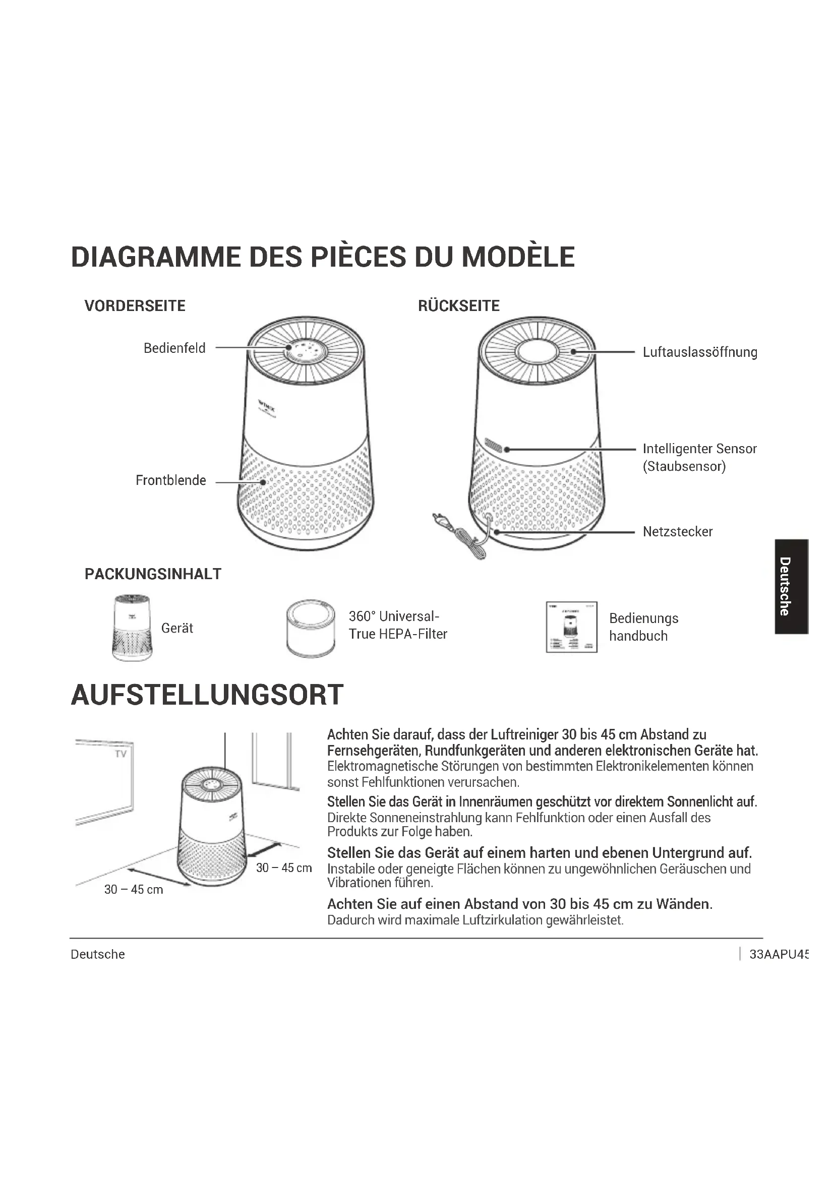 AUFSTELLUNGSORT DIAGRAMME DES PIÈCES DU MODÈLE Achten Sie darauf, dass der Luftreiniger 30 bis 45cm Abstand zu Fernsehgeräten, Rundfunkgeräten und anderen elektronischen Geräte hat. Elektromagnetische Störungen von bestimmten Elektronikelementen können sonst Fehlfunktionen verursachen. Stellen Sie das Gerät in Innenräumen geschützt vor direktem Sonnenlicht auf. Direkte Sonneneinstrahlung kann Fehlfunktion oder einen Ausfall des Produkts zur Folge haben. Stellen Sie das Gerät auf einem harten und ebenen Untergrund auf. Instabile oder geneigte Flächen können zu ungewöhnlichen Geräuschen und Vibrationen führen. Achten Sie auf einen Abstand von 30 bis 45cm zu Wänden. Dadurch wird maximale Luftzirkulation gewährleistet. VORDERSEITE PACKUNGSINHALT Bedienfeld Luftauslassöffnung Frontblende Intelligenter Sensor (Staubsensor) Netzstecker RÜCKSEITE Gerät 360° Universal- True HEPA-Filter Bedienungs handbuch 30–45cm30–45cm DeutscheDeutsche Deutsche