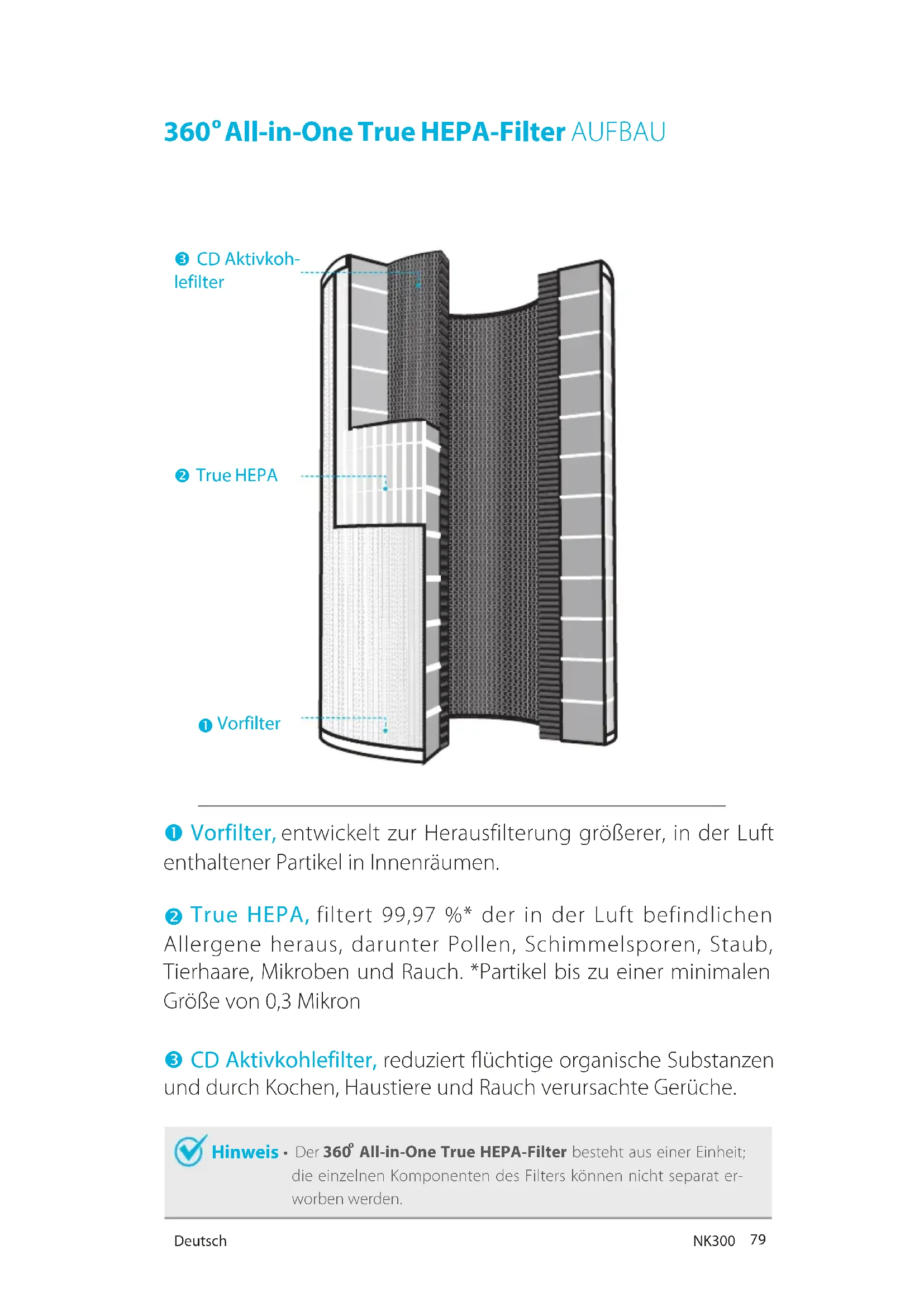 All-in-One True HEPA-Filter besteht aus einer Einheit; die einzelnen Komponenten des Filters können nicht separat er- worben werden. HinweisDeutsch NK300 FILTERINSTALLATION Das Produkt wird mit allen benötigten Filtern ausgeliefert. Vor der Verwen- dung muss die Plastik-Schutzhülle vom Filter abgenommen werden. Wird das Gerät betrieben, ohne die Plastikhülle zu entfernen, dann kann dies zum Ausfall des Produkts führen. Ausstecken und sicherstellen, dass das Gerät ausgeschaltet ist, bevor der Filter installiert wird.